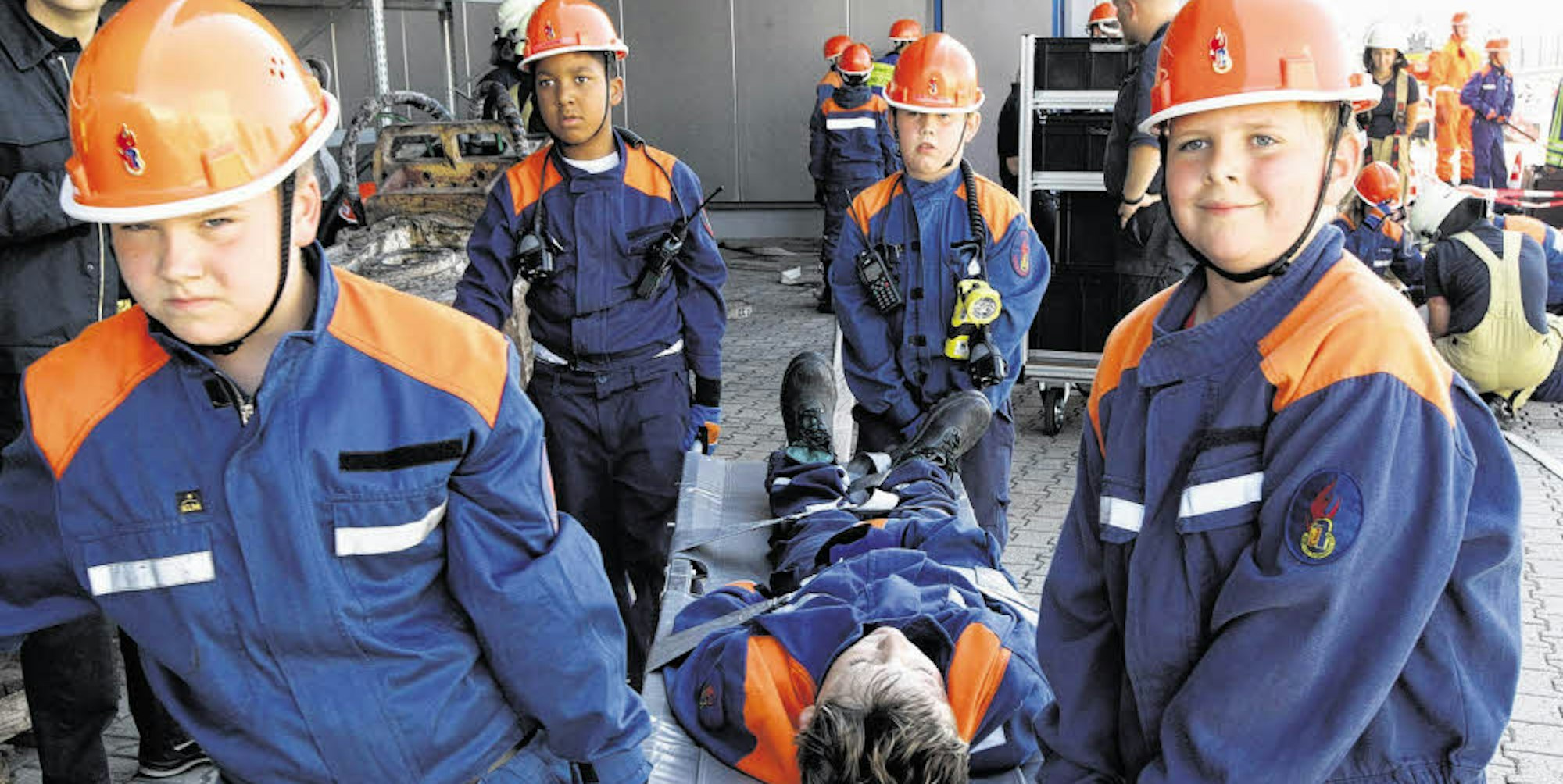 Feuerwehrfrau Svenja Knerr von der Löschgruppe Wahlscheid hat, kurz bevor die Wagen mit Tatütata auf den Hof einbiegen, schnell noch drei Jungen ein blaues Auge verpasst und einem Mädchen eine klaffende Wunde. Die mit Schminke und Theaterblut in Verletzte Verwandelten verstecken sich in der Halle. Ein Trupp mit Mini-Sauerstoffflaschen auf dem Rücken muss jetzt suchen. Draußen warten die Jung-Malteser mit Tragen. Mit vollem Ernst und Eifer geht’s zur Sache. Mit dem Wissen, dass aus dem Spiel später Ernst werden wird, für die Älteren vielleicht schon im kommenden Jahr. Ab 18 können sie zur Freiwilligen Feuerwehr wechseln, die in Lohmar zu Verkehrsunfällen, Haus- und Waldbränden ausrückt. Dass die Jungen und Mädchen bei der Stange bleiben, auch dazu solle die Übung mit Übernachtung in den Gerätehäusern dienen, erläutert Kevin Rölleke, Jugendwart aus Wahlscheid.