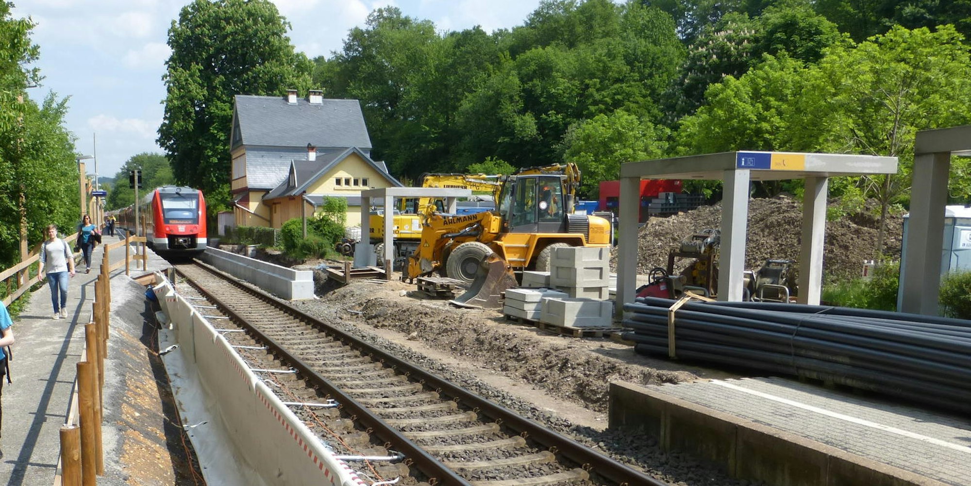 Für den Umbau des Bahnsteigs (rechts des Gleises) wurde ein provisorischer Bahnsteig (links) angelegt, damit Fahrgäste während der Bauphase weiter in Honrath zu- und aussteigen können.