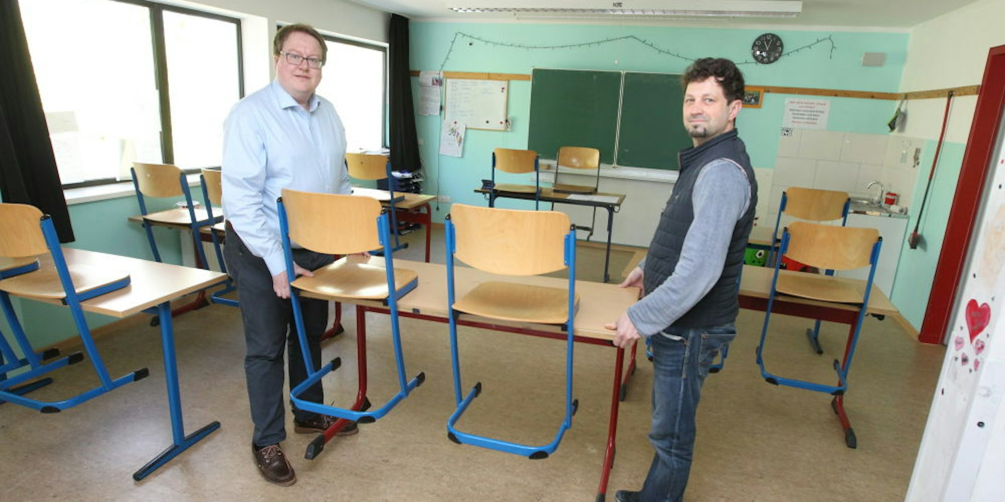Nur noch fünf Schüler je Klassenraum sollen demnächst im Kunstkolleg sitzen. Dr. Marcus Wüst (links) und Raimund Pabst schafften Platz für Abstand.