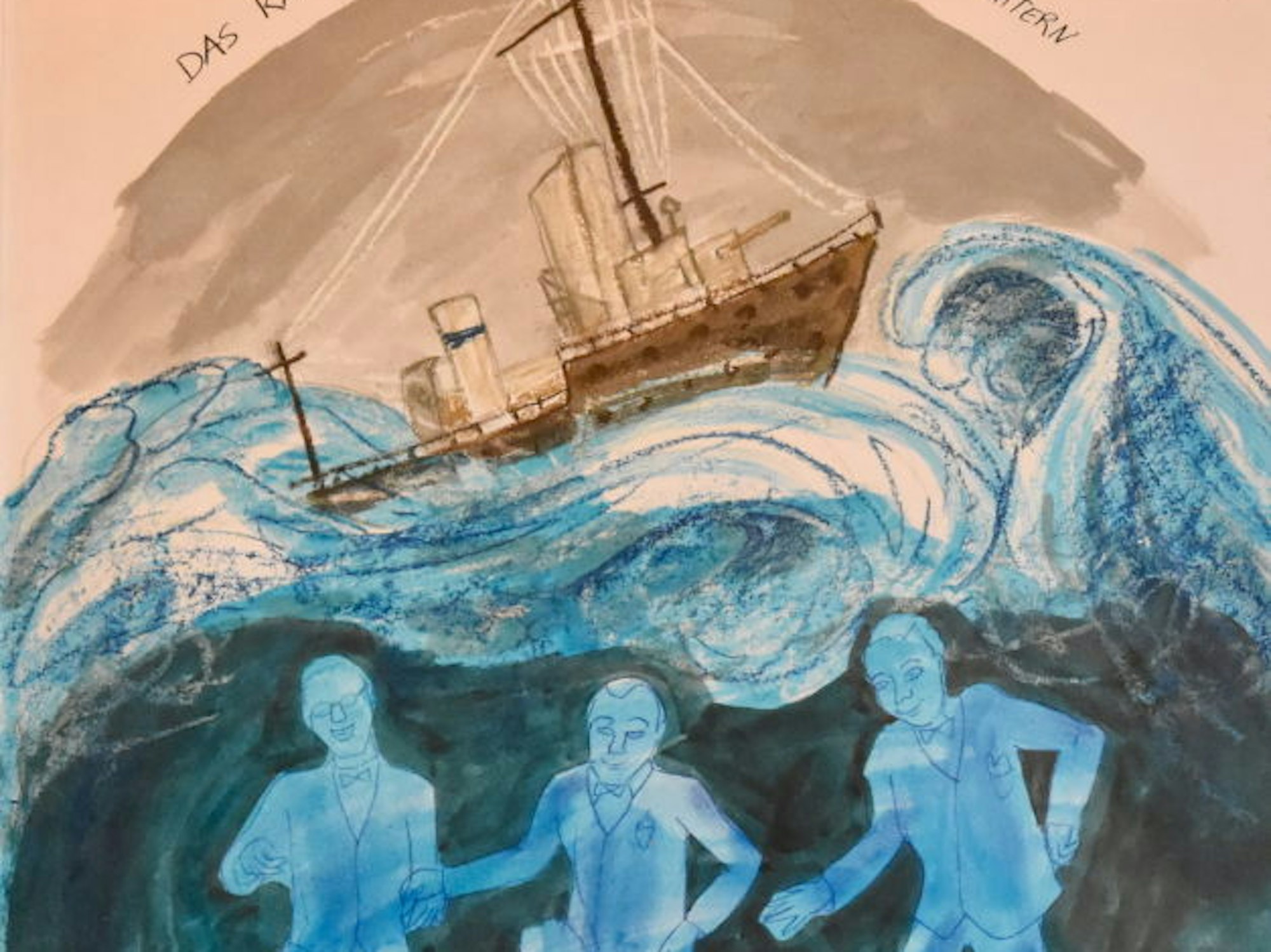 19 Bilder fertigte Elisa Regnier für die Revue im Kunsthaus Seelscheid an. In der Zusammenarbeit mit Burkard Sondermeier – sie malte sieben Bilder im Oktober 2018 im Kunsthaus – habe sie „sehr, sehr viel gelernt zum Thema Krieg“, berichtet sie. Im Dreiklang mit der Musik und den Texten sollten die Bilder stehen. Die Malerin setzte sie ergreifend ausdrucksstark um, etwa zu dem Lied „Das kann doch einen Seemann nicht erschüttern“, das Sondermeier „ein Propagandalied“ nennt, „mit dem die Marinesoldaten fröhlich in den Tod geschickt wurden“. Auf Regniers Bild treibt ein sinkendes Kriegsschiff in stürmischer See und in der dunklen Tiefe tanzen drei Soldaten in der Manier des pfiffigen Schauspieler-Trios Rühmann, Sieber, Brausewetter. „Die Seelen tanzen weiter“ wollte die Malerin als Botschaft weitergeben.