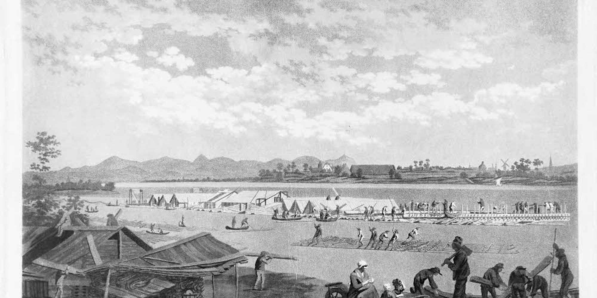 Elmar Scheuren, Leiter des Siebengebirgsmuseums in Königswinter, kennt das Bild aus dem Kölner Stadtmuseum gut, das ein französischer Zeichner um 1800 angefertigt hat und das den Bau eines riesigen Floßes zeigt. Holzplanken werden am Ufer behauen, Material lagert unter provisorischen Hüttendächern, Boote transportieren Bauteile zu einem großen Floß, auf dem Männer arbeiten und Wohnbaracken stehen.
