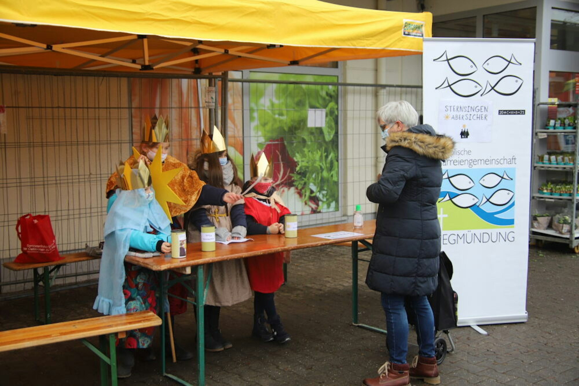 Anja Becker als Leiterin Teams überlegte mit Kerstin Lenders, Udo Bendorf und Gaby Ervens, was denn stattdessen geht. Und so kamen sie auf die Idee, wenn die Kinder in den Kostümen der Heiligen Drei Könige nicht zu den Menschen kommen können, sollen die Menschen zu den Sternsingern kommen. Im Dorf bauten sie an sechs Stellen gelbe und dadurch sehr auffällige Pavillons auf. Durch die dezentrale Verteilung wollten sie Menschenansammlungen vermeiden. In Zwei-Stunden-Schichten standen die Kinder mit jeweils zwei bis drei Erwachsenen bereit. Sie hatten alle Hände voll zu tun.