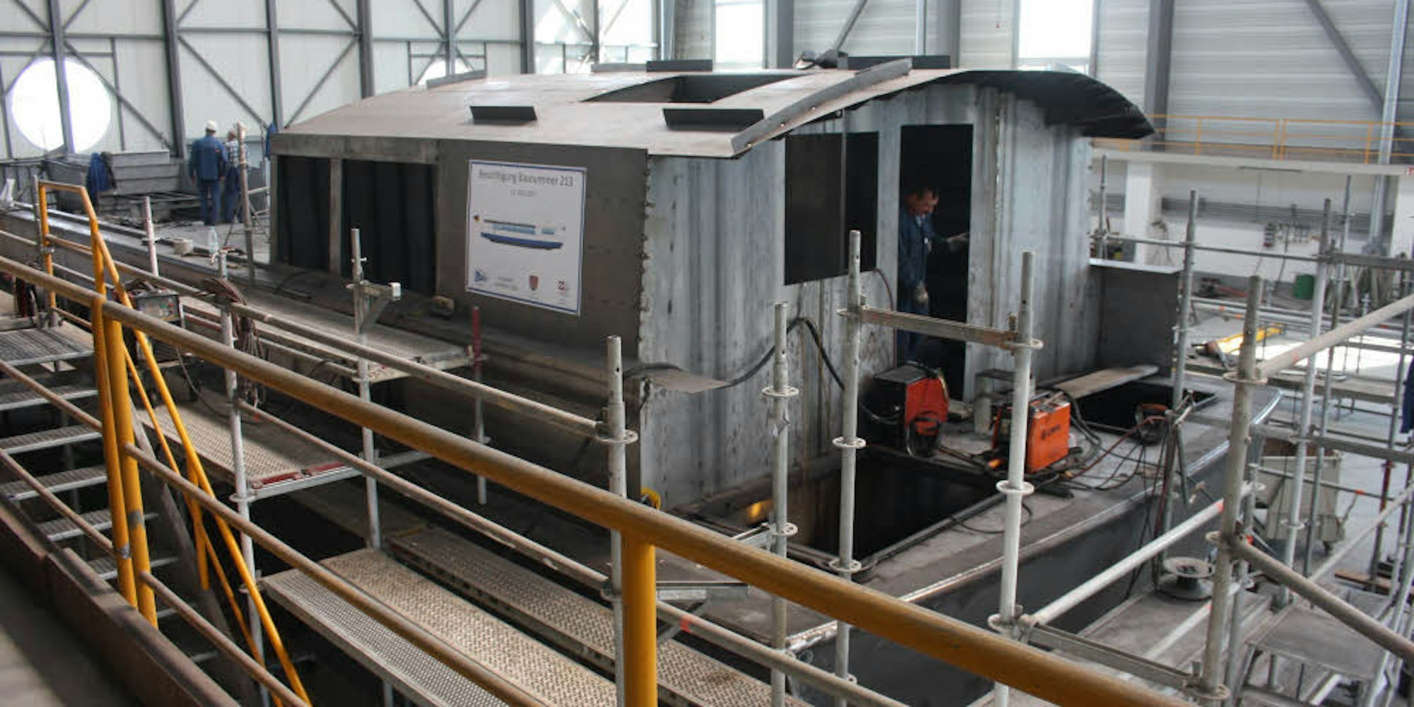 In der großen Halle der Niederkasseler Lux-Werft nimmt die neue Lülsdorfer Personenfähre langsam Gestalt an. Voraussichtlich im September soll das Schiff vom Stapel laufen.