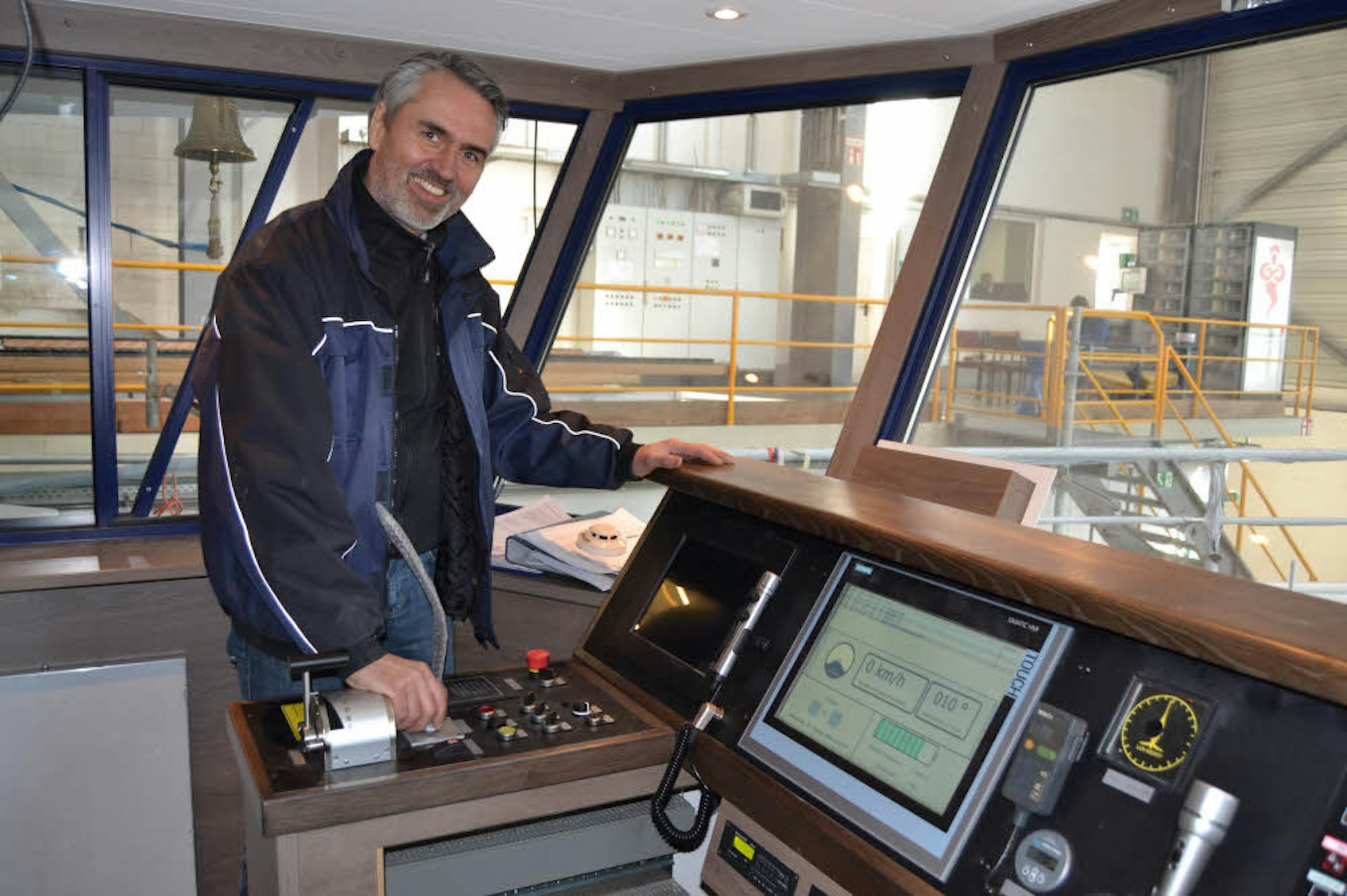 Lux-Werft-Geschäftsführer Elmar Miebach-Oedekoven blickt zufrieden auf das Steuerpult der bis zu 10 km/h schnellen St. Nikolaus.