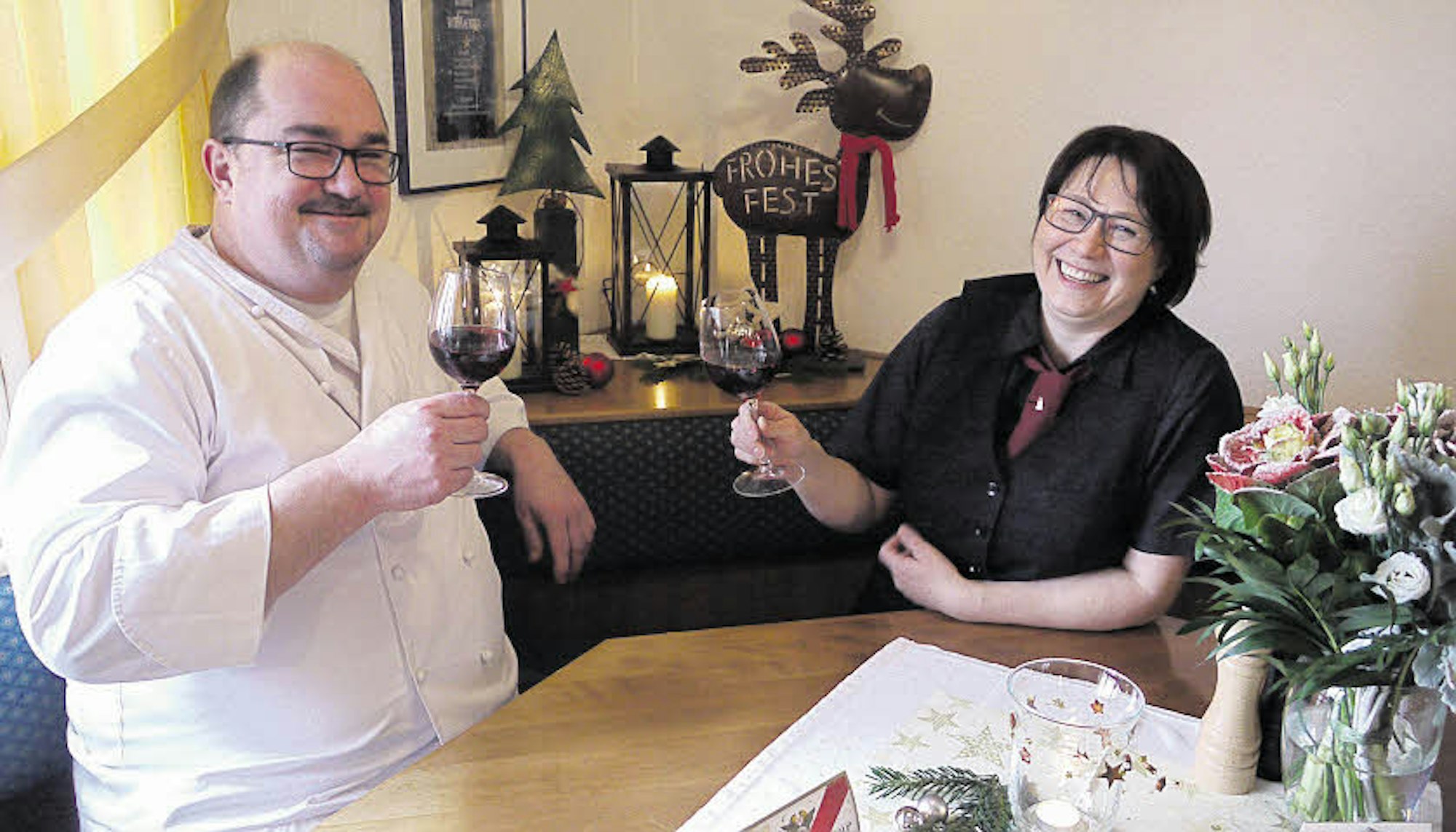 Mit Rotwein von deutschen Winzern: Stephan und Ute Pauly vom Restaurant „Zur Talsperre“ in Siegburg-Braschoss.