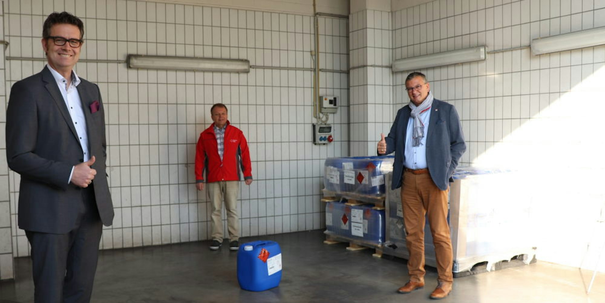 Standortleiter Arndt Selbach übergab Desinfektionsmittel an Gerd Röhrig (DRK) und Bürgermeister Stephan Vehreschild.