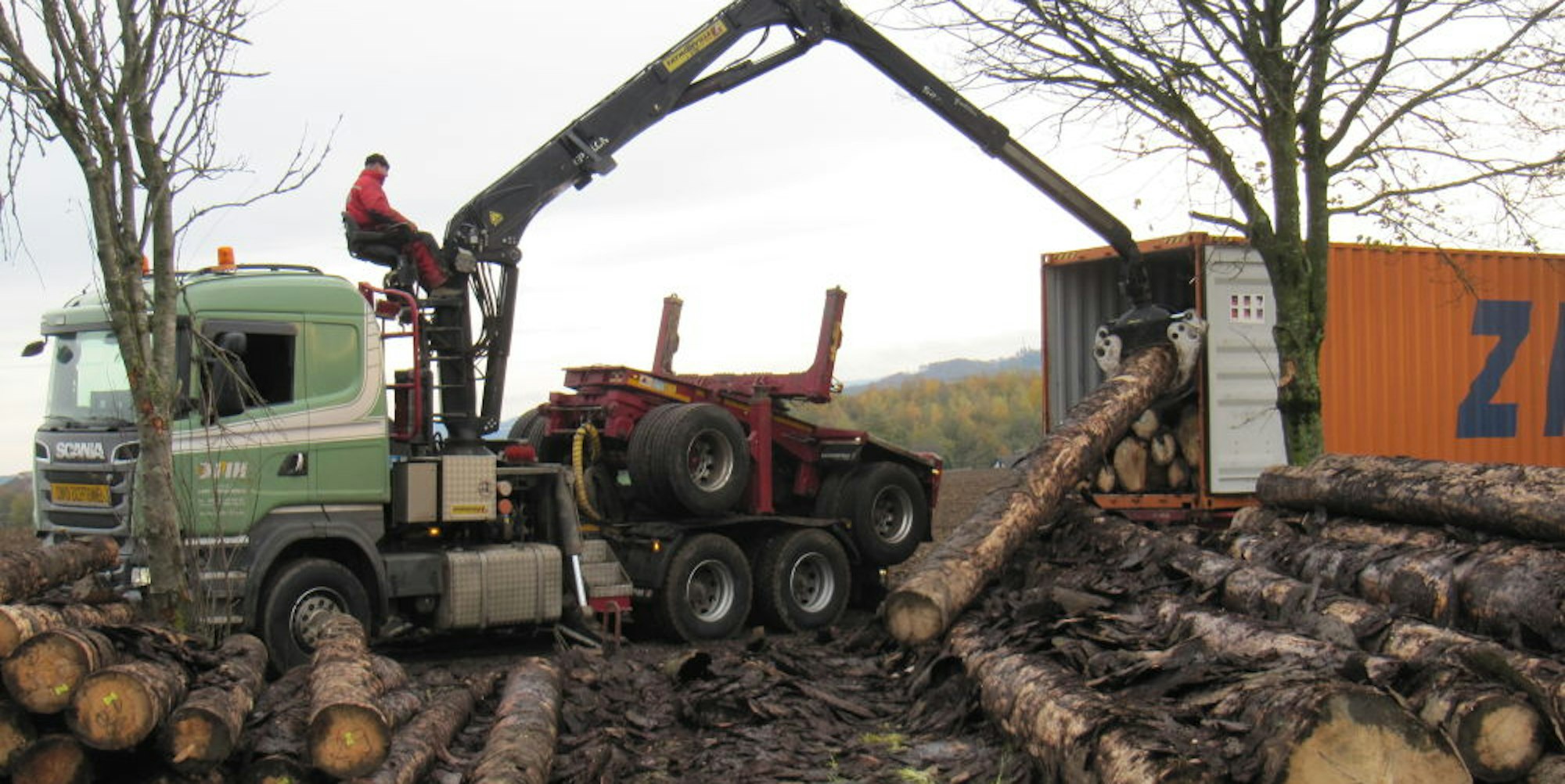 An der Ökumenischen Schöpfungskapelle Remshagen wird Holz direkt in einen Überseecontainer verladen.