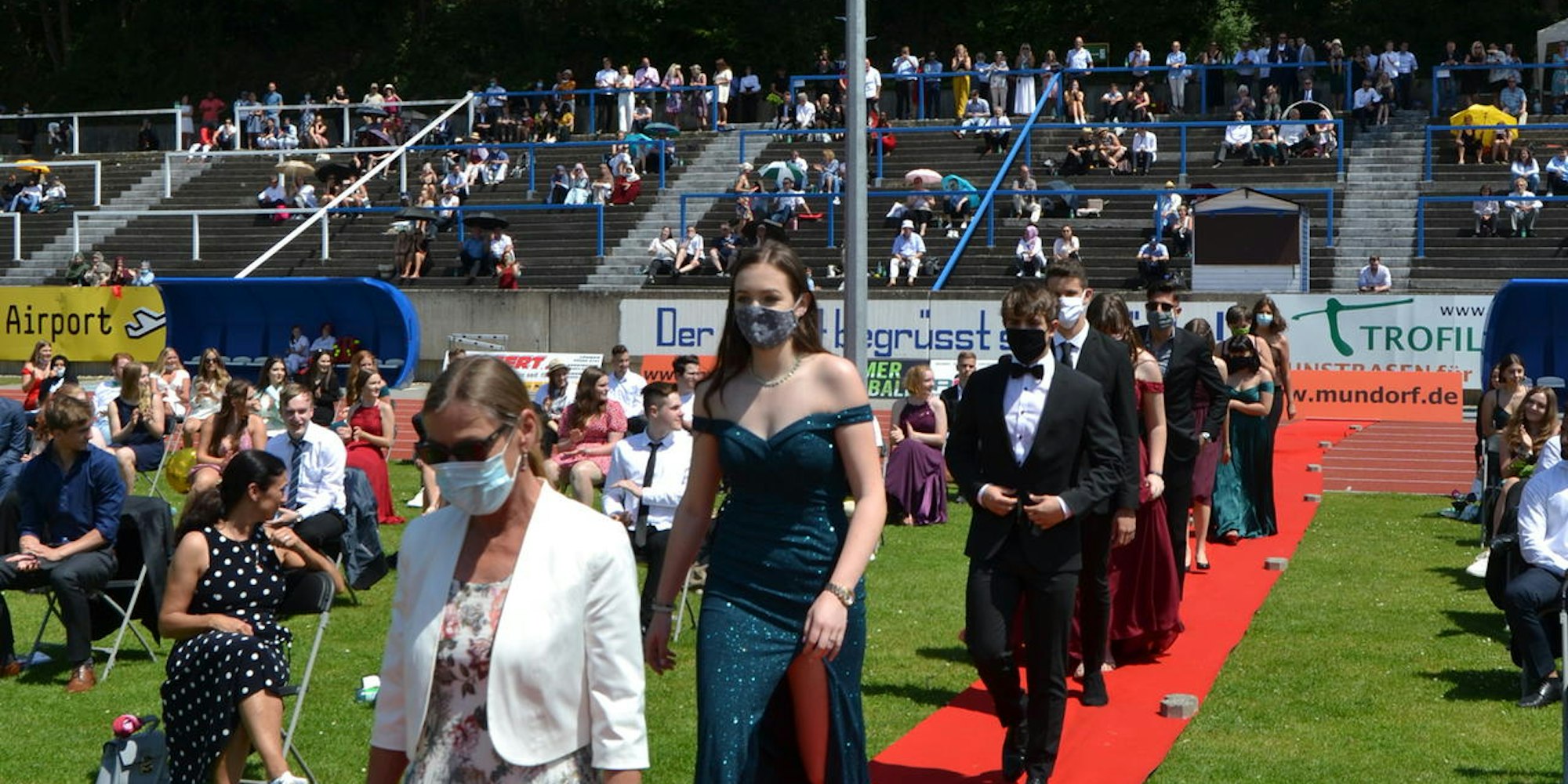 Das Siegtal-Gymnasium Eitorf hatte ebenfalls Glück mit dem Wetter, die Feier konnte auf dem Schulhof stattfinden. 75 Schüler und Schülerinnen bekamen dort ihre Zeugnisse. So konnten Mindestabstände eingehalten und auch die Eltern eingeladen werden. Verzichten mussten die Absolventen, wie auch alle anderen ihres Jahrgangs, auf die übliche Motto-Woche, den Abi-Gag, die Veranstaltung Abi in Concert und auch auf den Abi-Ball. Lange war unsicher, ob überhaupt Abiturprüfungen abgenommen werden könnten.