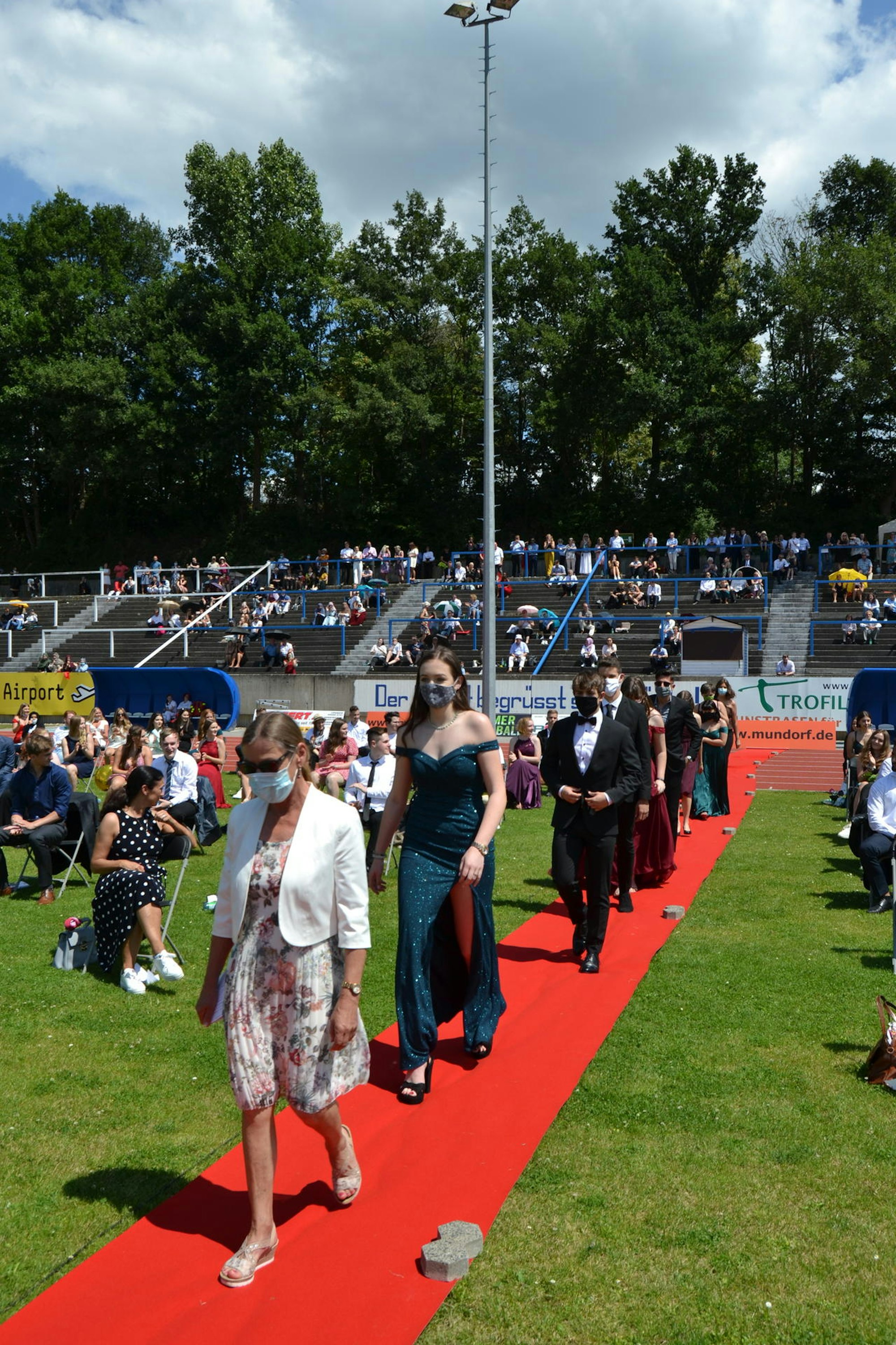 Das Gymnasium Alleestraße Siegburg brachte einen Hauch von „Royal Ascot“ ins Walter-Mundorf-Stadion: Schicke Hüte, elegante Kleider und Anzüge wurden bei strahlend schönem Wetter auf gepflegtem Rasen gesehen. 102 Absolventinnen und Absolventen nahmen ihre Zeugnisse entgegen, für die besten des Jahrgangs gab es eine besondere Auszeichnung. Paula Novotny, Mona Reichmann und Pia Sasse legten ihr Abitur mit dem Notendurchschnitt 1,2, Ronja Hock mit 1,1 und Jan Hennes sogar mit 1,0 ab.