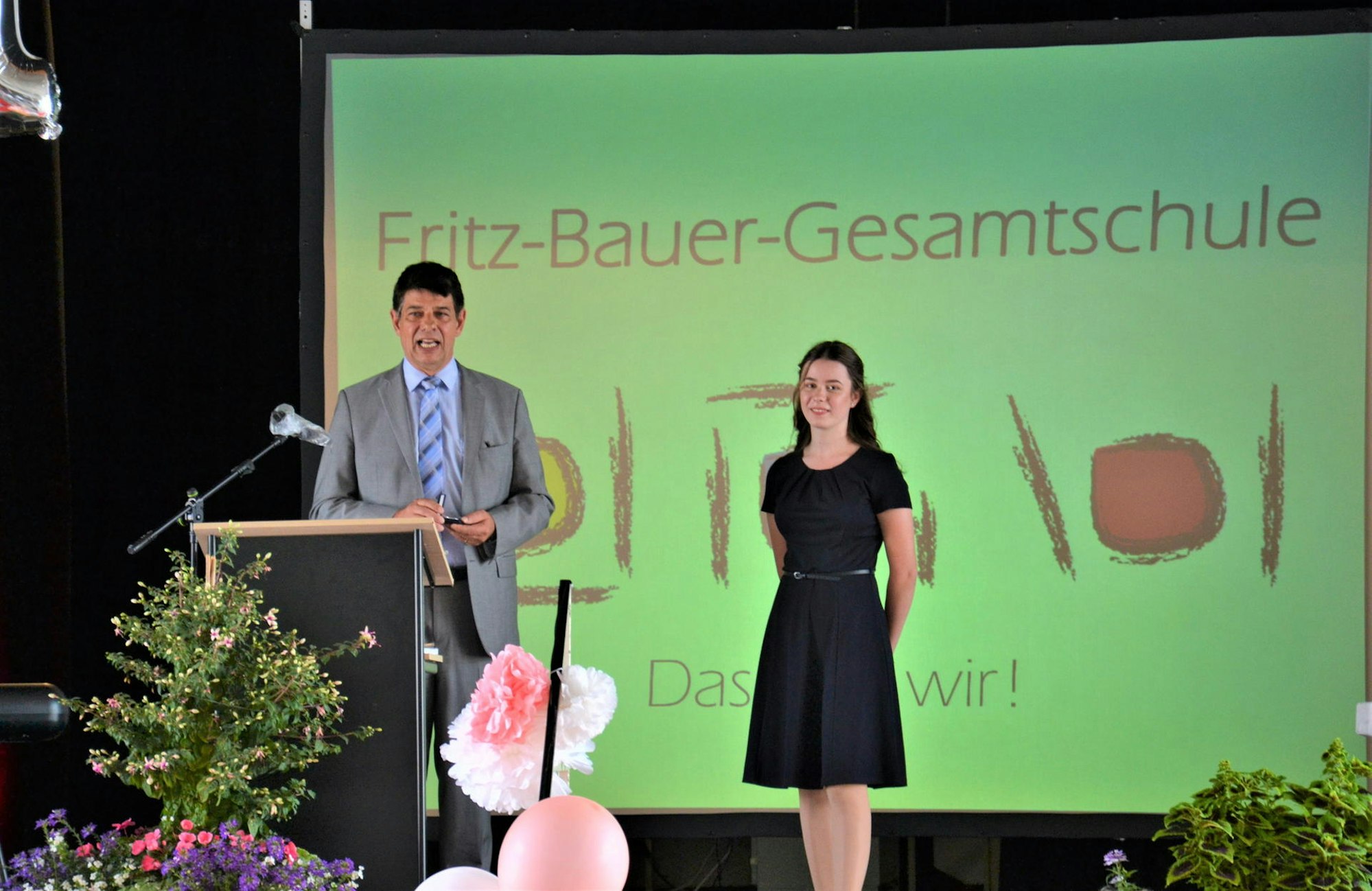 Klaus Schumacher gratulierte Carina Hochheuser, der Jahrgangsbesten der Fritz-Bauer-Gesamtschule.