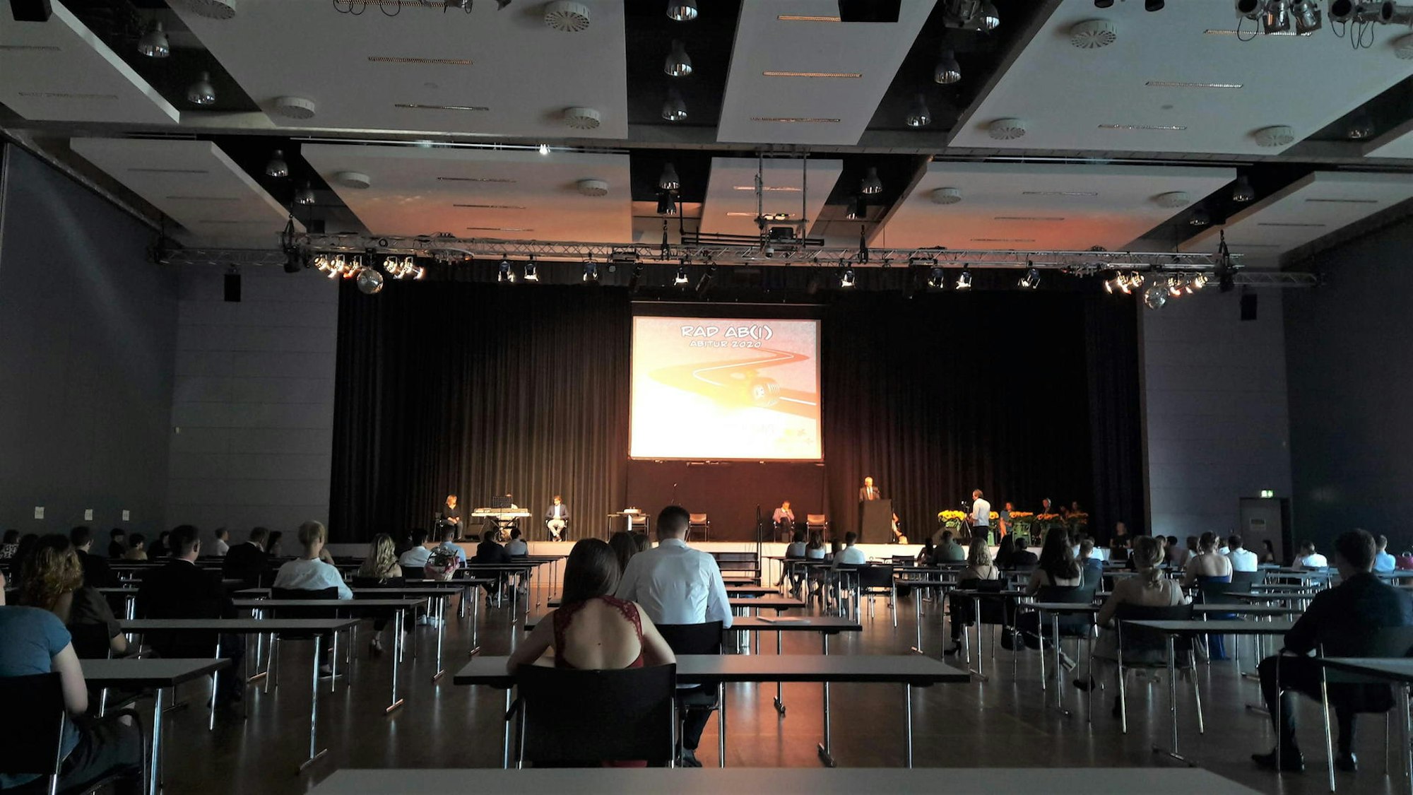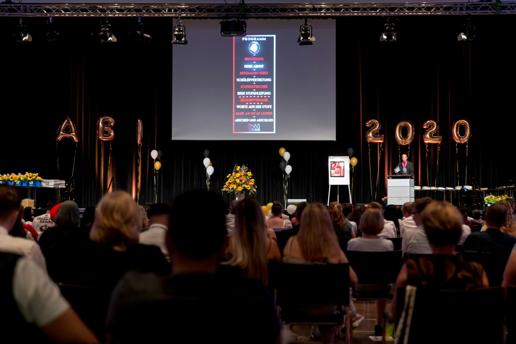 Die Fritz-Bauer-Gesamtschule Sankt Augustin konnte die corona-bedingten Abstands- und Hygienevorschriften in der eigenen Aula einhalten, wo festlicher Blumenschmuck, ein roter Teppich, roségoldfarbene Luftballons und ein stimmungsvoller Sternenhimmel für Atmosphäre sorgten. 46 Schülern hatten die allgemeine Hochschulreife erhalten und konnten mit Eltern, Lehrer und Vertretern der Stadt feiern.