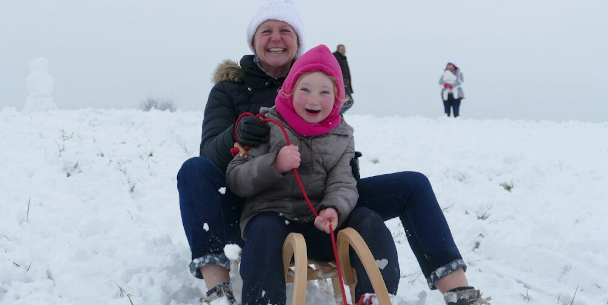 Franzi Hahne und ihre Tante Sandra Rother fuhren Schlitten auf einem Hang bei Lohmar-Birk.