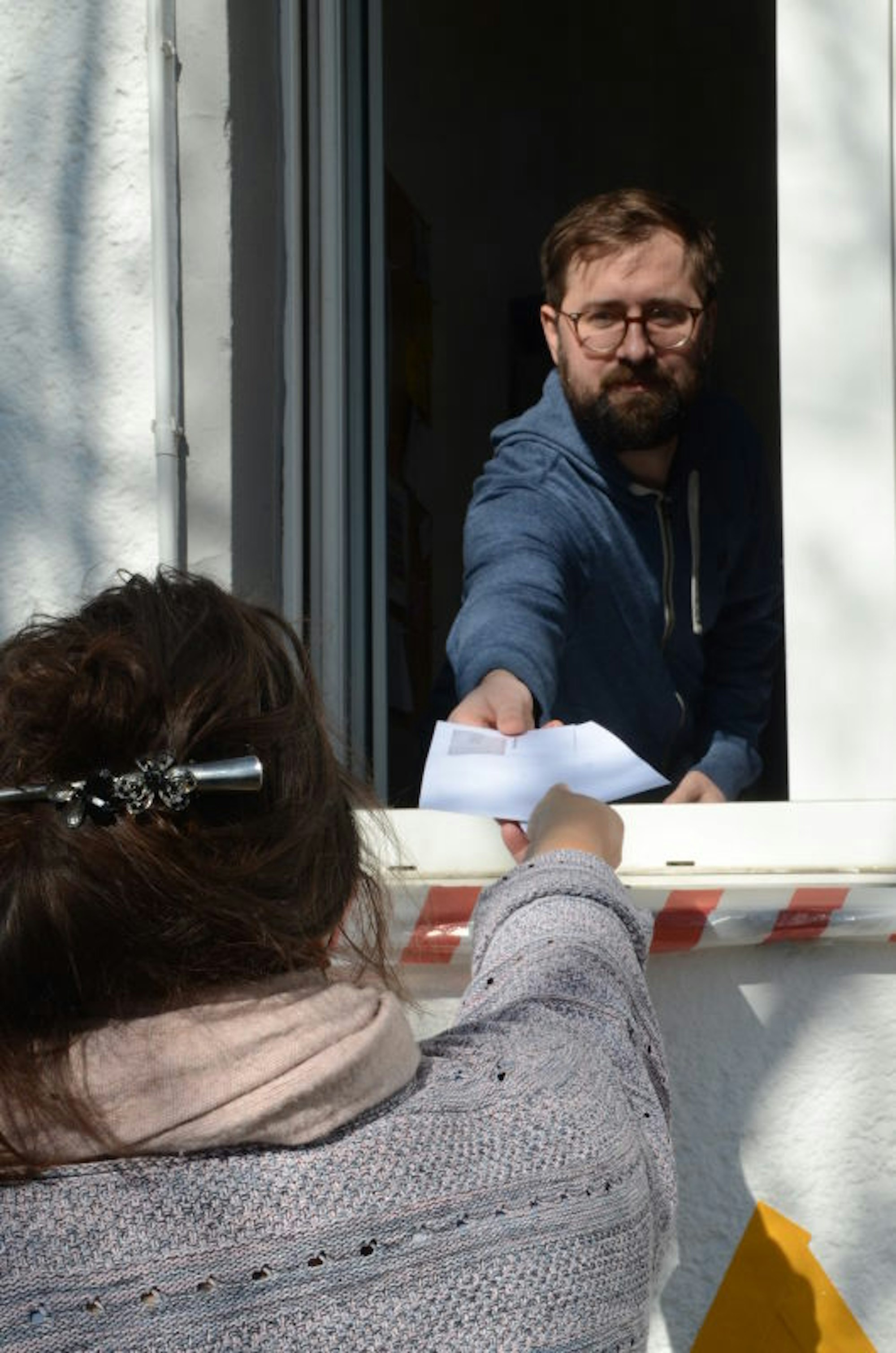 Post und Beratung nur am Fenster: Dominik Schmitz und seine Kollegen halten Abstand zu den Ratsuchenden und untereinander.