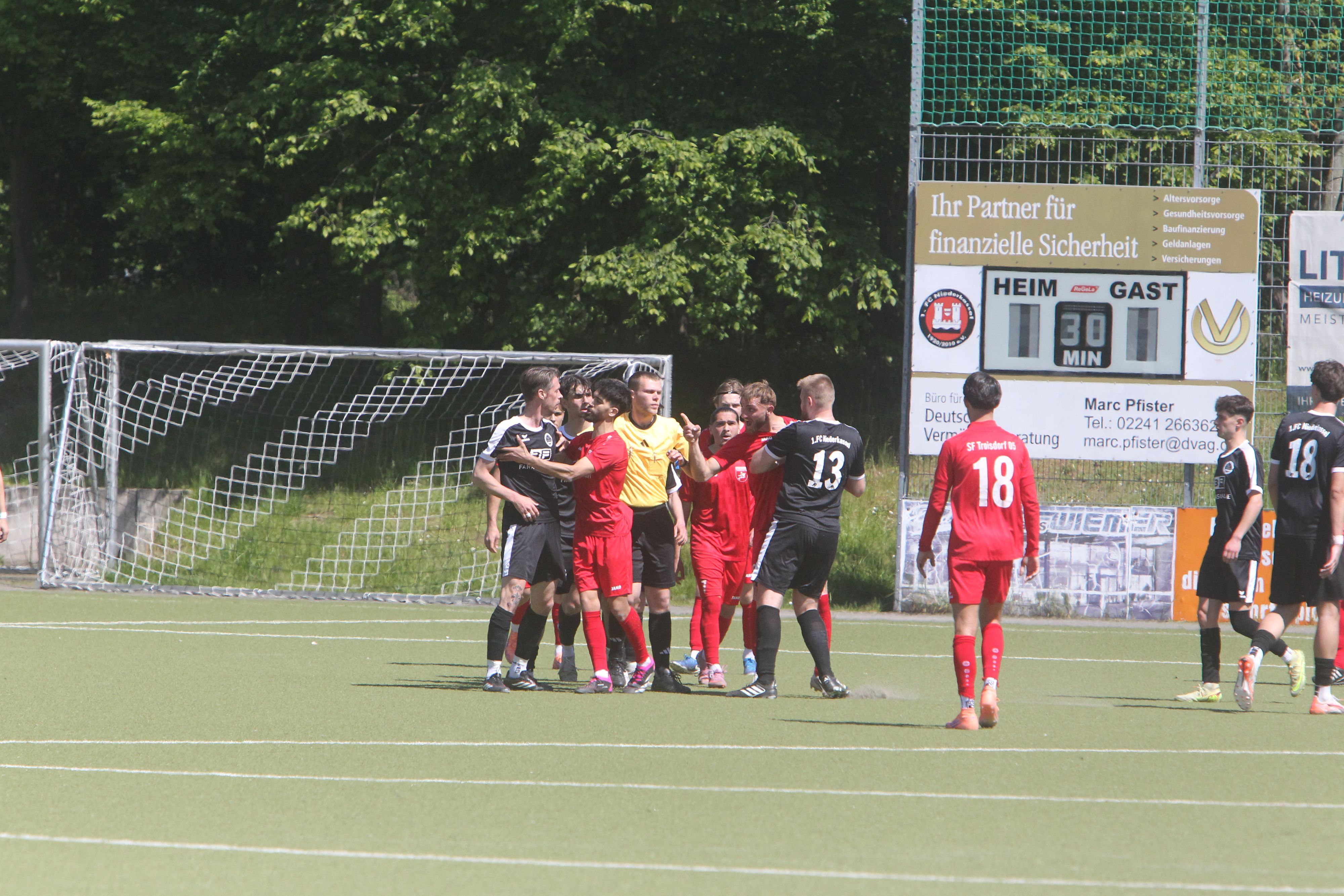 Ebenso bemerkenswert wie die 18-minütige Nachspielzeit (unter anderem wegen einer Platzwunde des Ex-Niederkasselers Abderafie Khabza) war die Tatsache, dass beim Abpfiff noch 22 Akteure auf dem Platz standen. Denn der Unparteiische verteilte zwölf Gelbe Karten, zehn davon an das Schlusslicht.