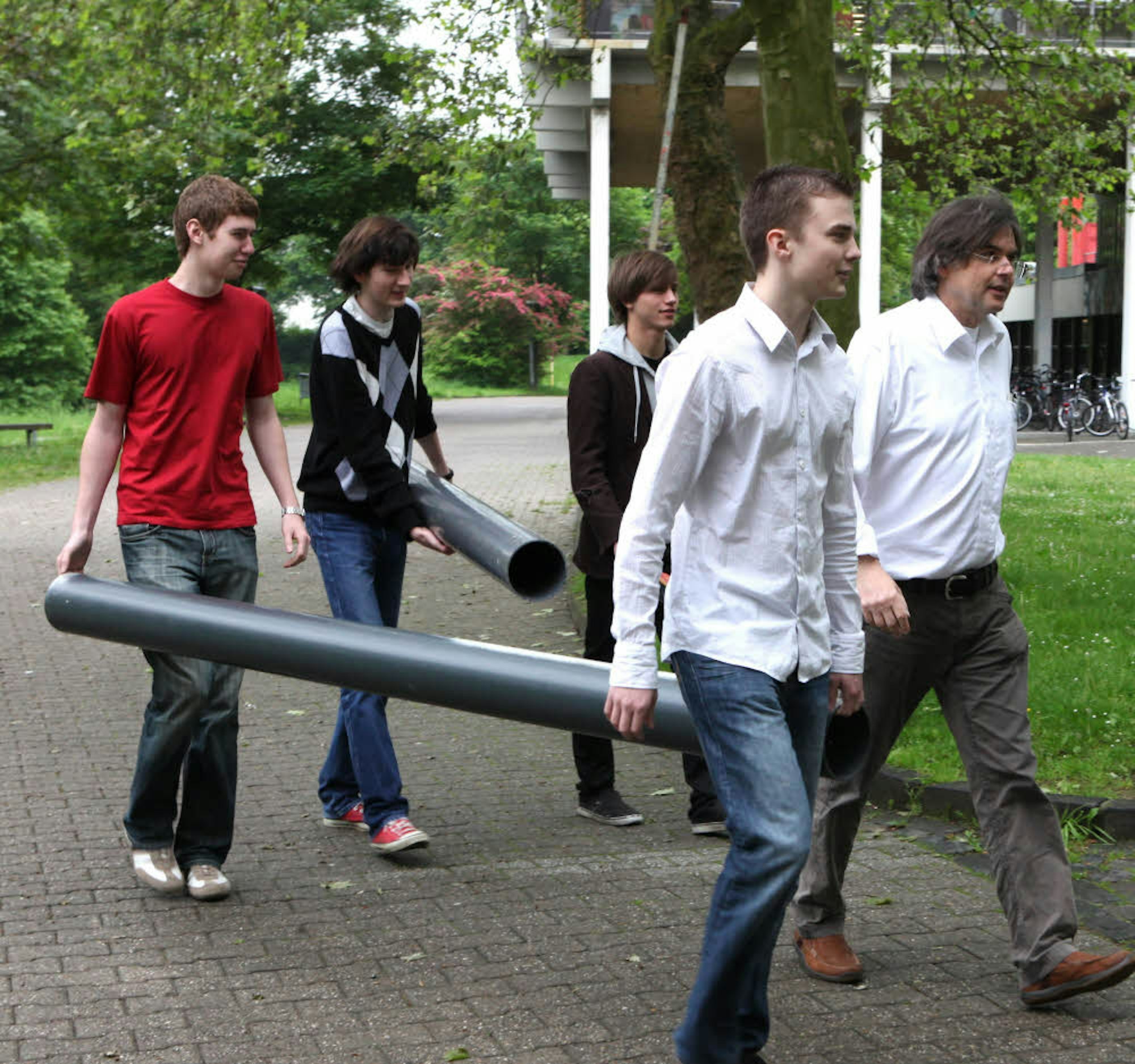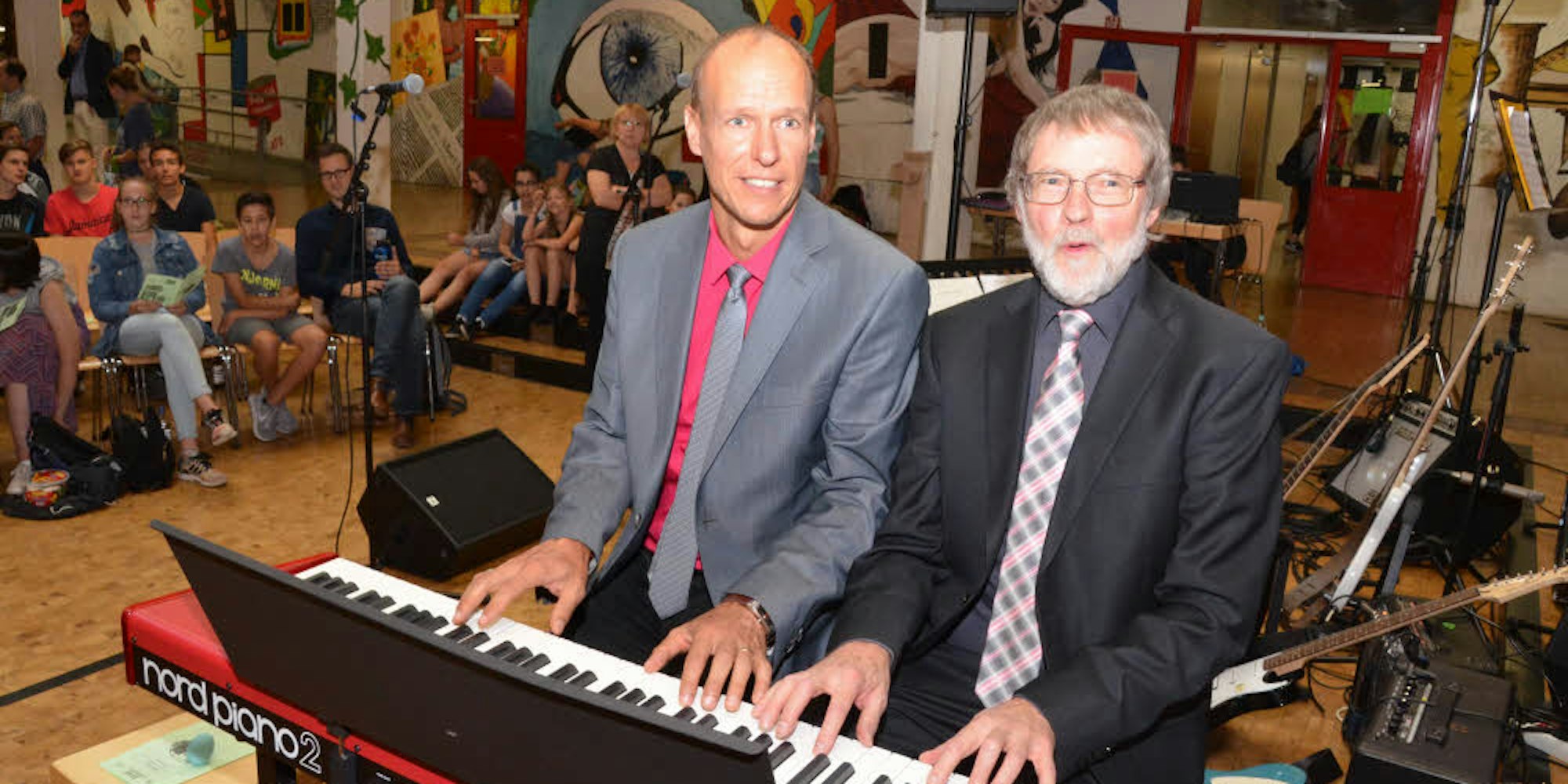 In den Ruhestand geht auch Kunsterzieher Willi Krings (r.), hier bei einer früheren Kunstaktion mit den Schülern.