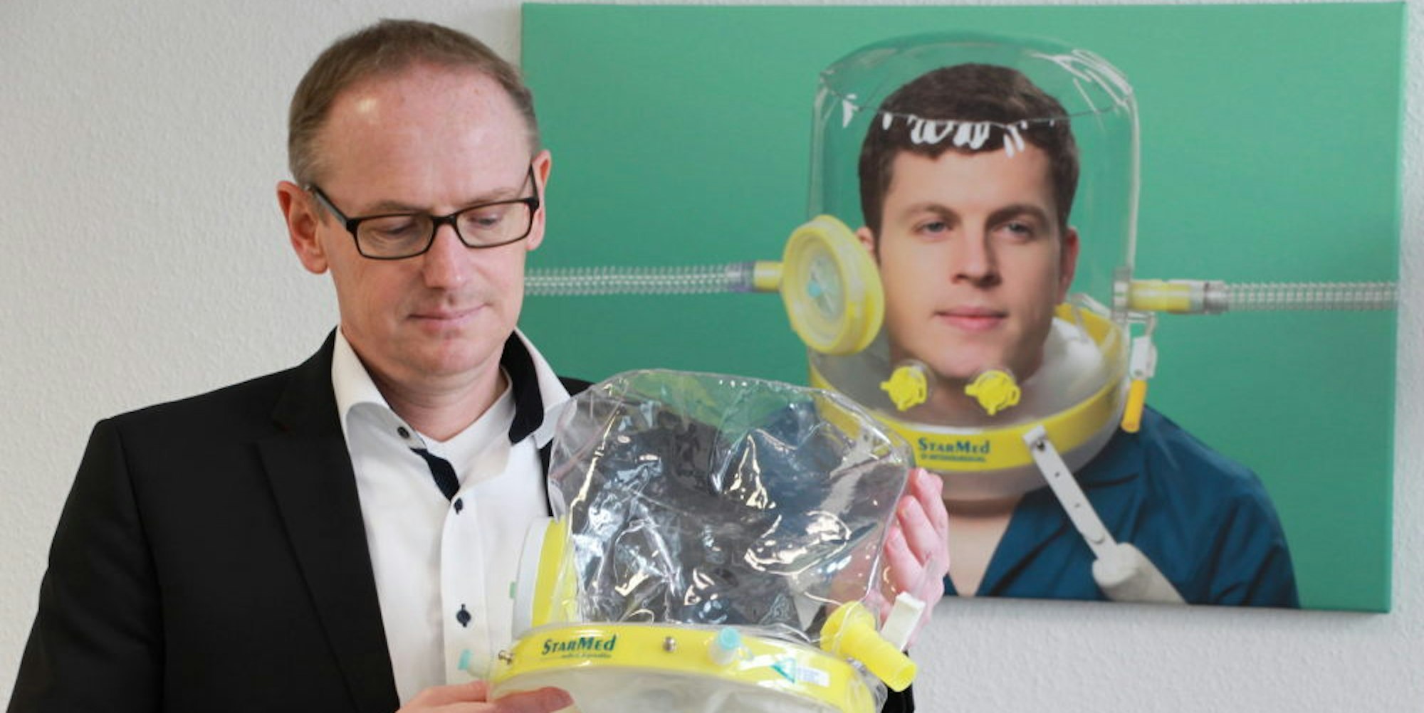 Geschäftsführer Bernd Siegburg zeigt den Beatmungshelm der Firma.