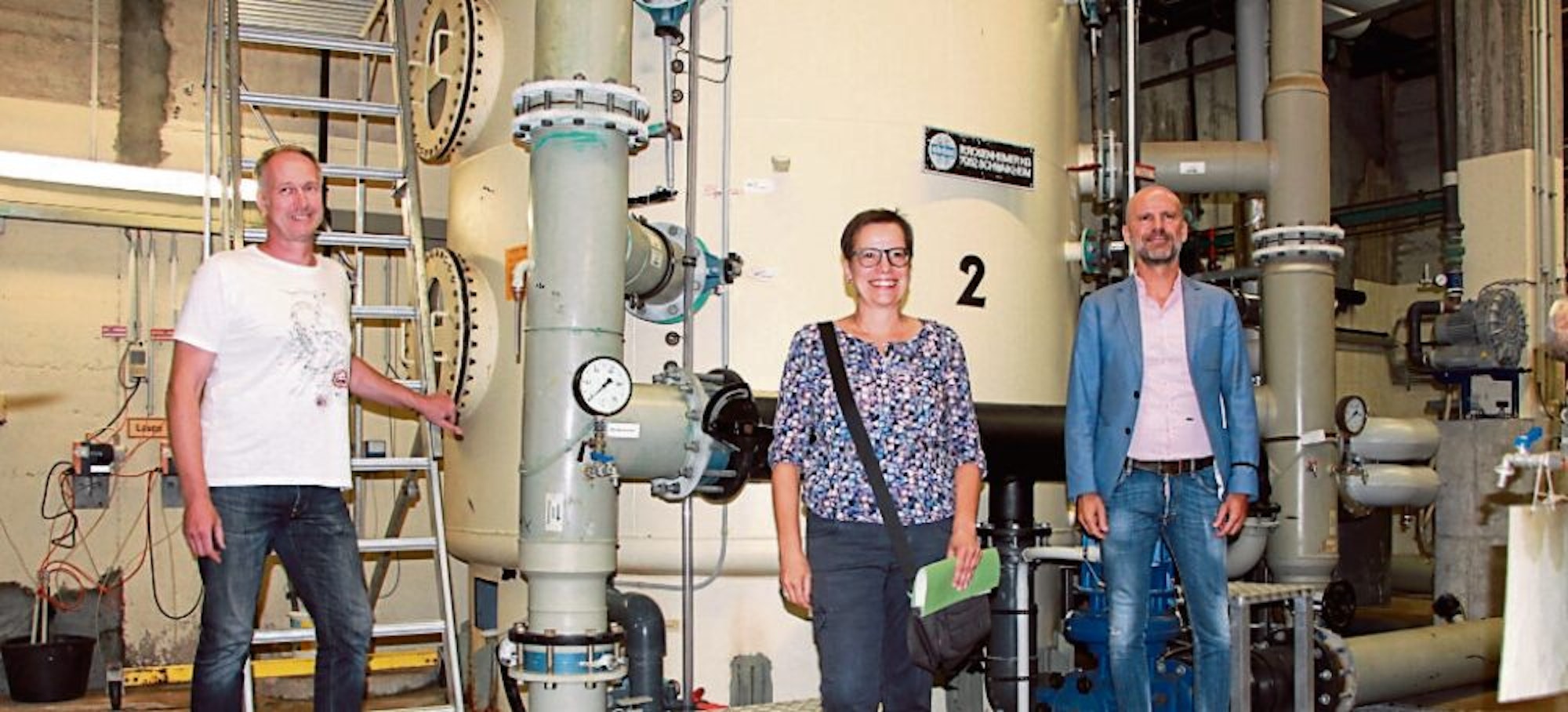 Betriebsleiter Thomas Gierse, Amtsleiterin Eva Stocksiefen und Fachbereichsleiter Markus Moeck (v.l) im Technikraum des Freibades.