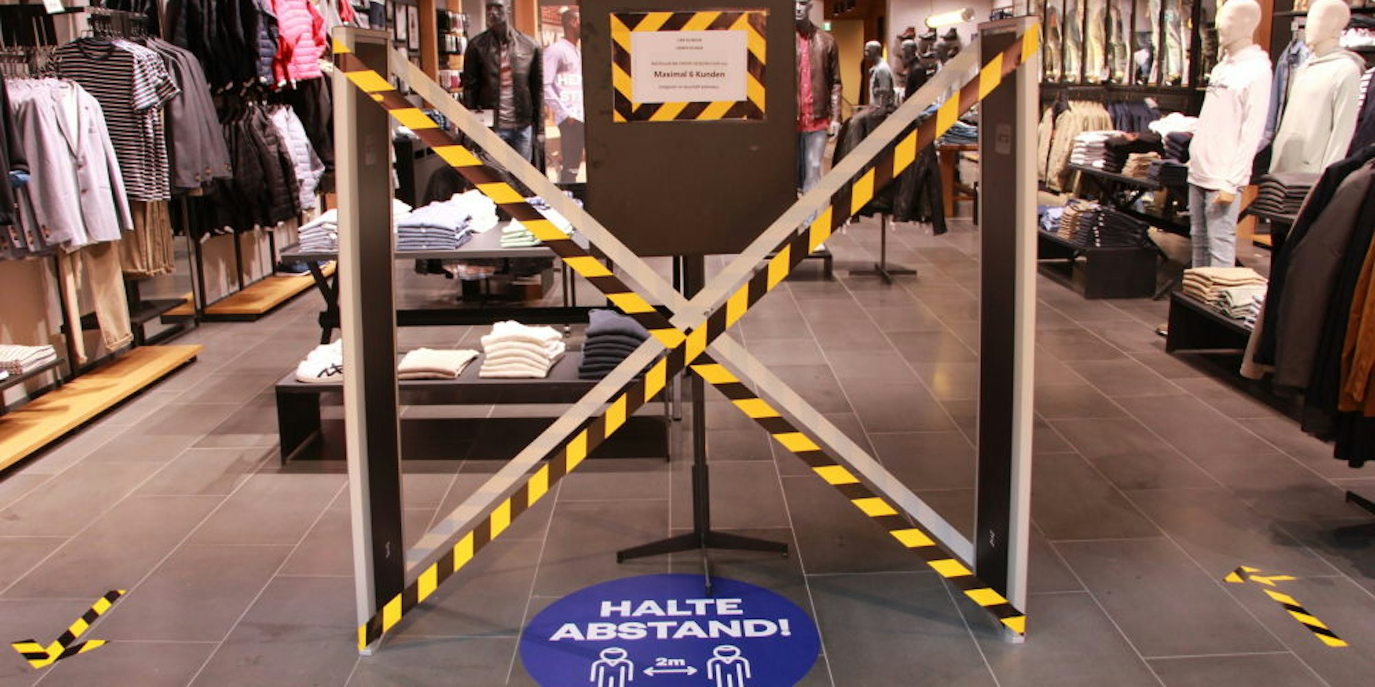 In den anderen Geschäften auf der Etage ist es ebenfalls ruhig. „Vorige Wochen hatten wir noch Kurzarbeit“, so ein Verkäufer, „die Info, dass wir jetzt wieder hier im Laden sein sollen, kam ganz kurzfristig.“ Auf den Fluren kleben die Mitarbeiter nun große Pfeile auf den Boden der Flure, die den Kunden die Laufrichtung im Einbahnverkehr weisen. So sollen Begegnungen vermieden werden. Angestellte des Centers achten darauf, dass niemand in die falsche Richtung geht.