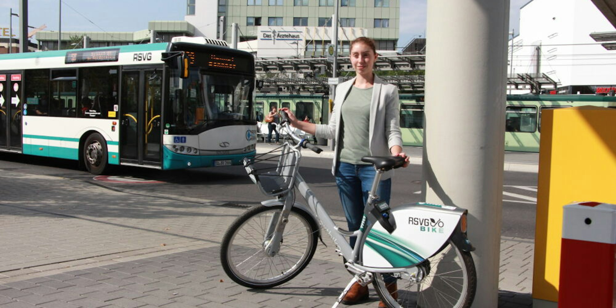 Sankt Augustin – Die städtische Mobilitätsmanagerin Jasmin Bies ließ es sich nicht nehmen, das Leihrad an der neuen Mobilstation am Stadtbahn-Haltepunkt Zentrum zu platzieren. „Ab dem 1. Oktober stehen zunächst 40 konventionelle Räder an acht Stationen im Stadtgebiet bereit“, erläuterte sie. Zu erkennen sind diese Stellen an einem Hinweisschild und einem Aufkleber auf dem Boden.