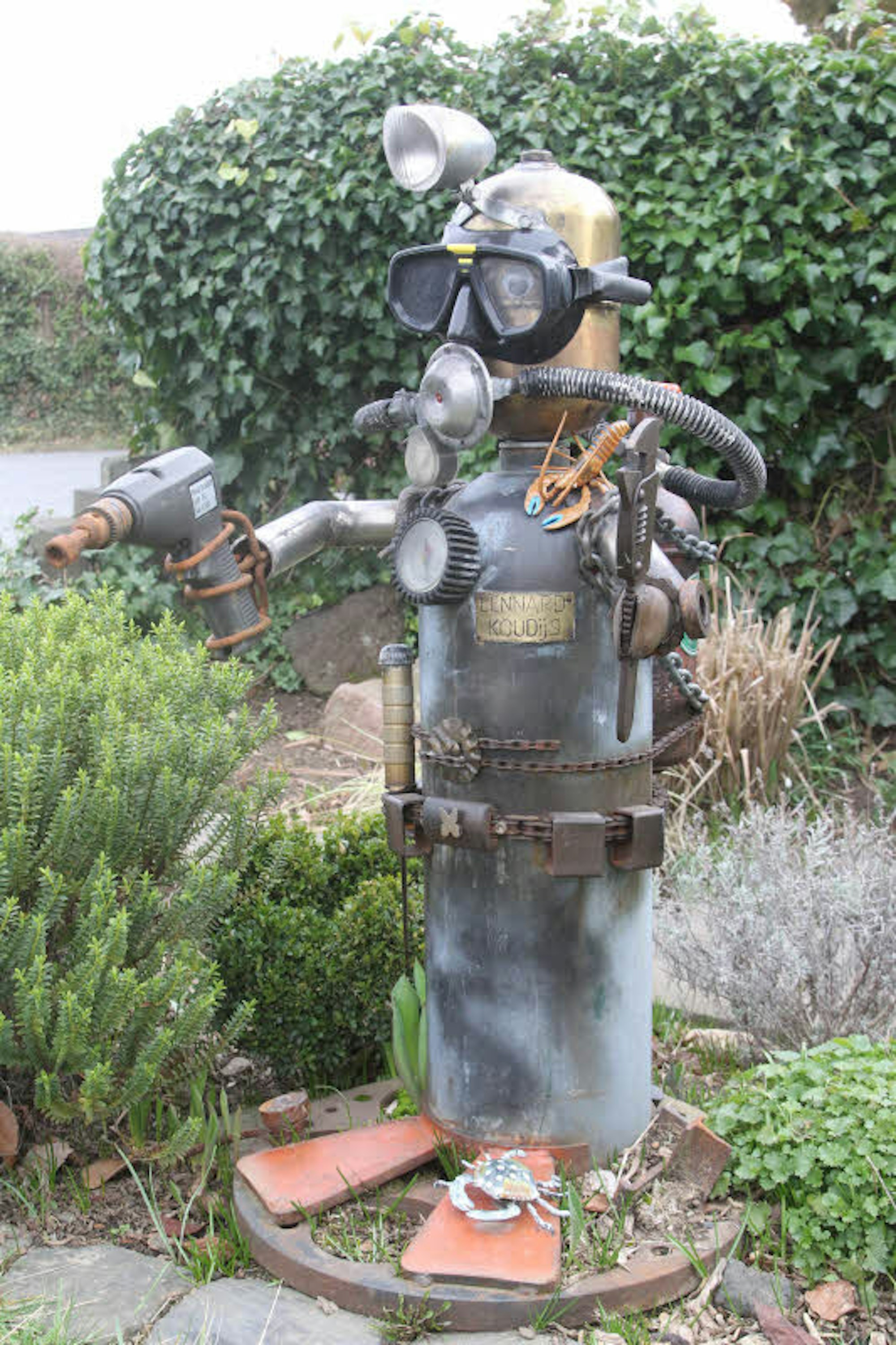 Inspirieren lässt sich Koch von seinen vielen Reisen. Er war bereits in den USA, in Südostasien und China. Und: Koch sind Begegnungen mit anderen Menschen wichtig. So steht in seinem Vorgarten nicht nur „Schrobbi“, sondern auch „Lennard“, dessen Körper aus einer Kohlensäureflasche besteht. Auf dem Rücken trägt er einen Feuerlöscher, Wackelaugen glotzen hinter einer aufgesetzten Taucherbrille hervor, und ein Spielzeugkrebs ziert den linken Metallarm des „Unterwasserinspektors“, wie Koch sein Werk nennt. Er ist einem guten Freund in den Niederlanden gewidmet, der Taucher von Beruf ist. „Lennard geht den Dingen auf den Grund“, sagt Koch.