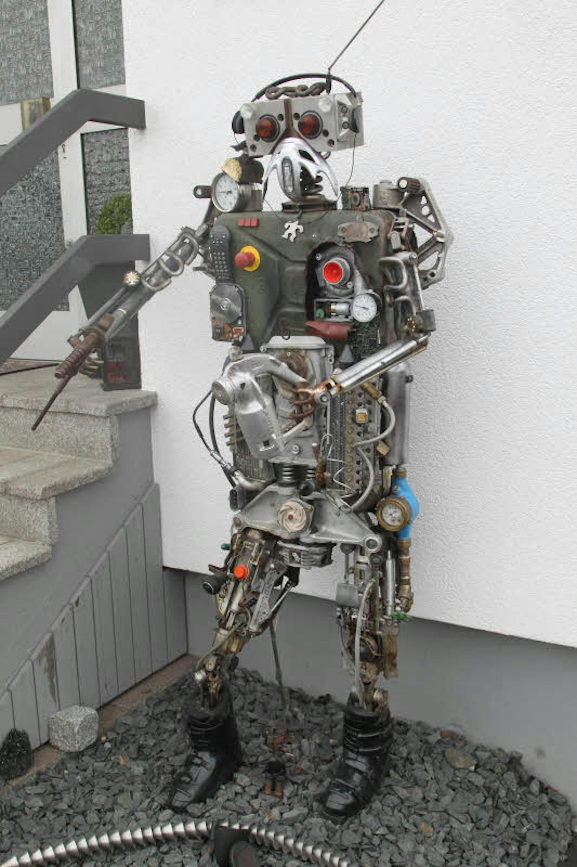 Sankt Augustin – Ein Bauch aus alten Dieselkanistern, die Arme und Beine sind Lenkstangen, der Kopf ein Sammelsurium ausgemusterter Ersatzteile: „Schrobbi“ nennt Roland Koch die mannshohe, außerirdisch wirkende Gestalt in seinem Vorgarten. Mit einer Bergmannslaterne in der rechten Blechhand begrüßt die Skulptur Besucher des Einfamilienhauses in Buisdorf.