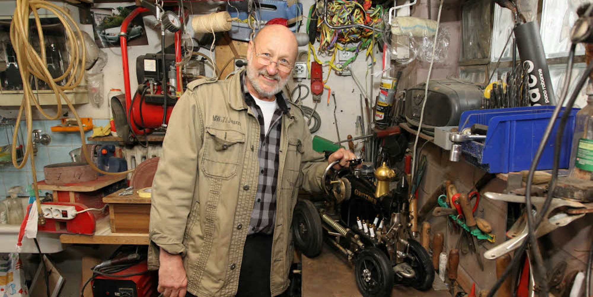 „Schrobbi“ ist das imposanteste Exponat in der Sammlung des 68-jährigen Rentners. In seinem früheren Beruf als Modellbauer hat Koch den Umgang mit Hobel, Feile und Raspel gelernt, er kann Maschinen bedienen, schweißen, drechseln und bohren.