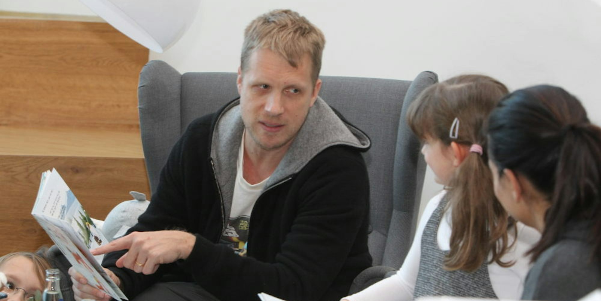 Der Komiker Oliver Pocher las mit Kindern aus dem Buch „Was hat Fini denn bloß?“.