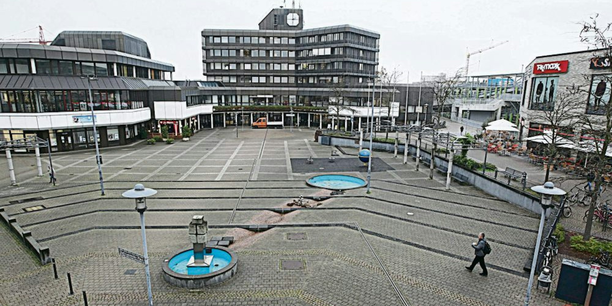 Wesentlich teurer als geplant wird die Modernisierung des Rathauses (Bildmitte) am Karl-Gatzweiler-Platz.