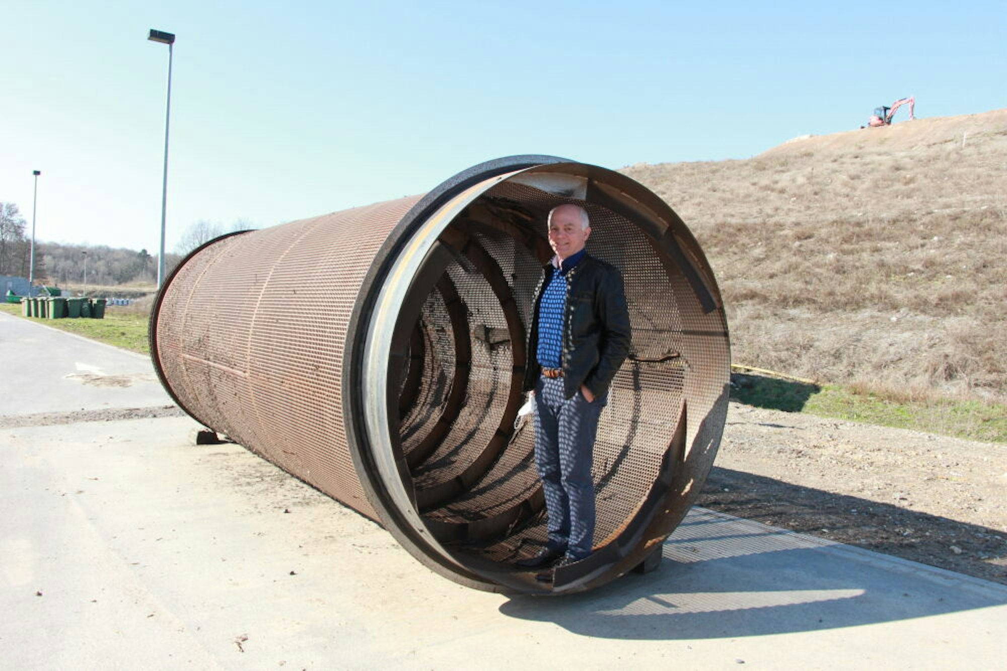In das menschenhohe Sieb kann RSAG-Sprecher Joachim Schölzel sich problemlos hineinstellen. Rechts: Der Grünschnitt wird an einer provisorischen Ablagestelle zwischengelagert.