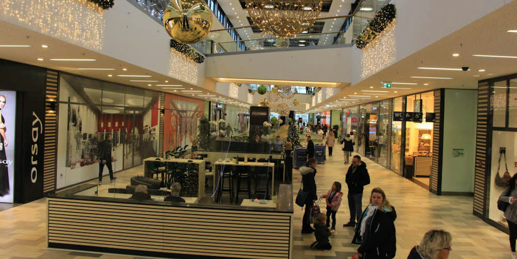 Weihnachtlich geschmückt ist das Innere. Kunden kommen nicht nur zum Einkaufen, ein großes Center wie das Huma lebt heute auch von seiner Gastronomie und seinen Erlebnisangeboten.