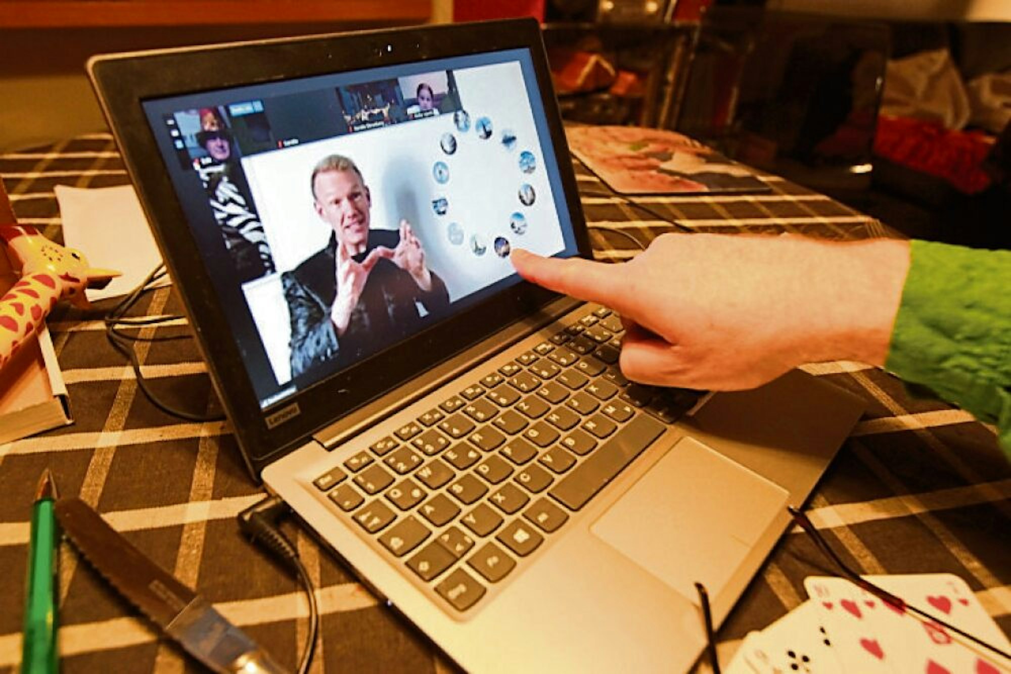 Kameras angeklickt, die Mikrofone aus: Die Magier – ganz ohne Hüte und Klimbim – machen sich mit ein paar munteren Wortwitzchen warm. Der blonde Albin und der dunkelhaarige Ingo stehen vor einer weißen Backsteinwand, blicken in die Kamera und zugleich in die Wohnräume in Bamberg und Beuel, München, Troisdorf, Lohmar, Sankt Augustin und Hürth. Die Zuschauer-Galerie am oberen Bildschirmrand lässt sich von allen per Mausklick betrachten. Die meisten Gäste sind gut zu sehen, der hohe Hut unseres Zauberlehrlings leider nicht in Gänze; bei einigen Familien herrscht Kinoatmosphäre, sie bleiben im Dunkeln.