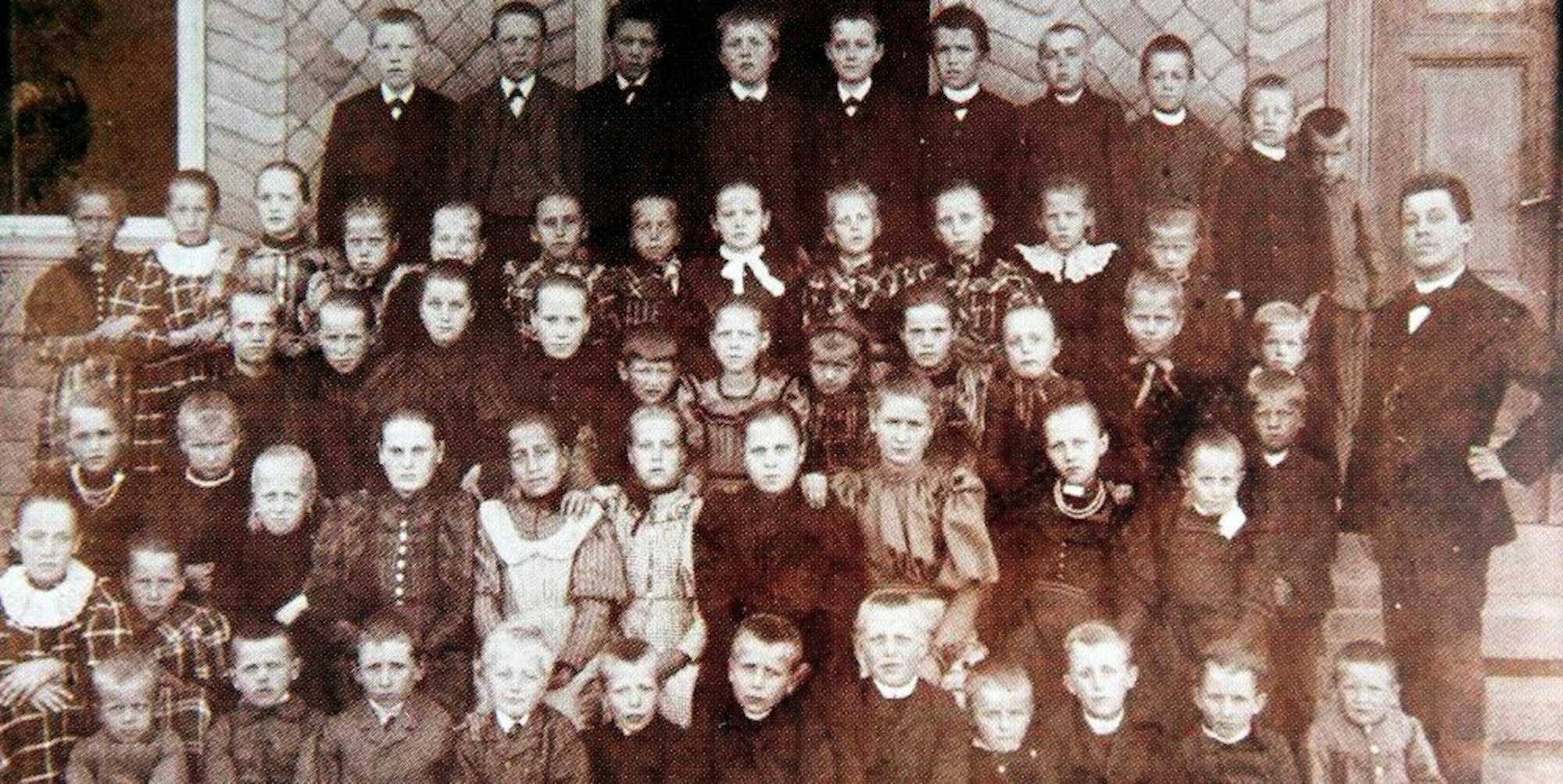 Ende des 19. Jahrhunderts: die Kinder der Volksschule Fußhollen. Ob rechts im Bild Lehrer B. posiert, bleibt unklar.