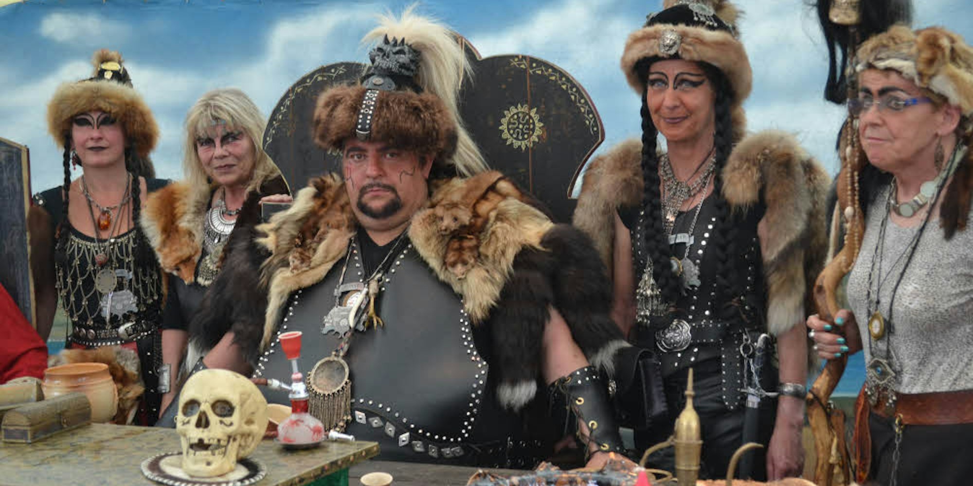 „Von den etwa 70 Vereinsmitgliedern verfügt etwa die Hälfte über eine eigene Rüstung“, erklärte Sprecherin Astrid Torsy. Mit ihrer dunklen, erdfarbenen Anmutung und den Leder- und Tierfellapplikationen orientieren sie sich zwar an den historischen Vorlagen, lassen aber genug Platz für die eigene Fantasie. Die Rüstungen werden selbst gebaut und können je nach verwendetem Material bis zu 1000 Euro kosten. „Besonders wichtig ist der getragene Schmuck, denn er verkörpert die Beute der Kriegszüge“, erläutert Torsy. Und die Hunnen sind emanzipiert, bei ihnen sind die Frauen gleichberechtigte Kriegerinnen. Prompt waren die prächtig geschmückten Amazonen die Hingucker bei diesem Lager.