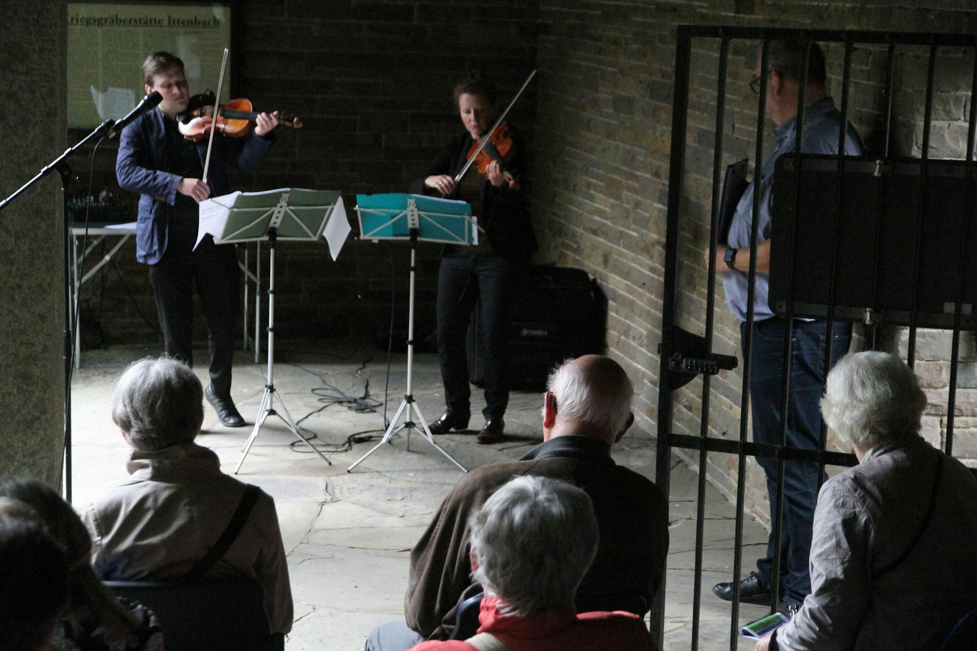 Mit Stücken von Johann Sebastian Bach und Bartók schufen Rostik Kezhnikov (Violine) und Justyna Sliwa (Viola) den gebotenen Rahmen für die Feier. Texte und Gedichte zur Geschichte der Zwangsarbeiter steuerte der Theologe Michaela Schwinge bei, Initiator des Projekts „Klassikmobil“. Annette Hirzel, Schulpfarrerin am Siegburger Anno- Gymnasium, zeigte Schülerarbeiten aus einem Projekt zum Thema – eine Plastik mit Händen, die ein buntes Herz umfassen, und eine Zeichnung, die den Marsch durch Kaldauen zeigt.