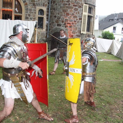 Drei weitere Kämpferpaare tun das Gleiche. Einer der jungen Männer trägt Schottenrock, ein anderer einen ledernen Harnisch, der Nächste Kettenhemd. Und alle führen ein Schwert in der Hand.
