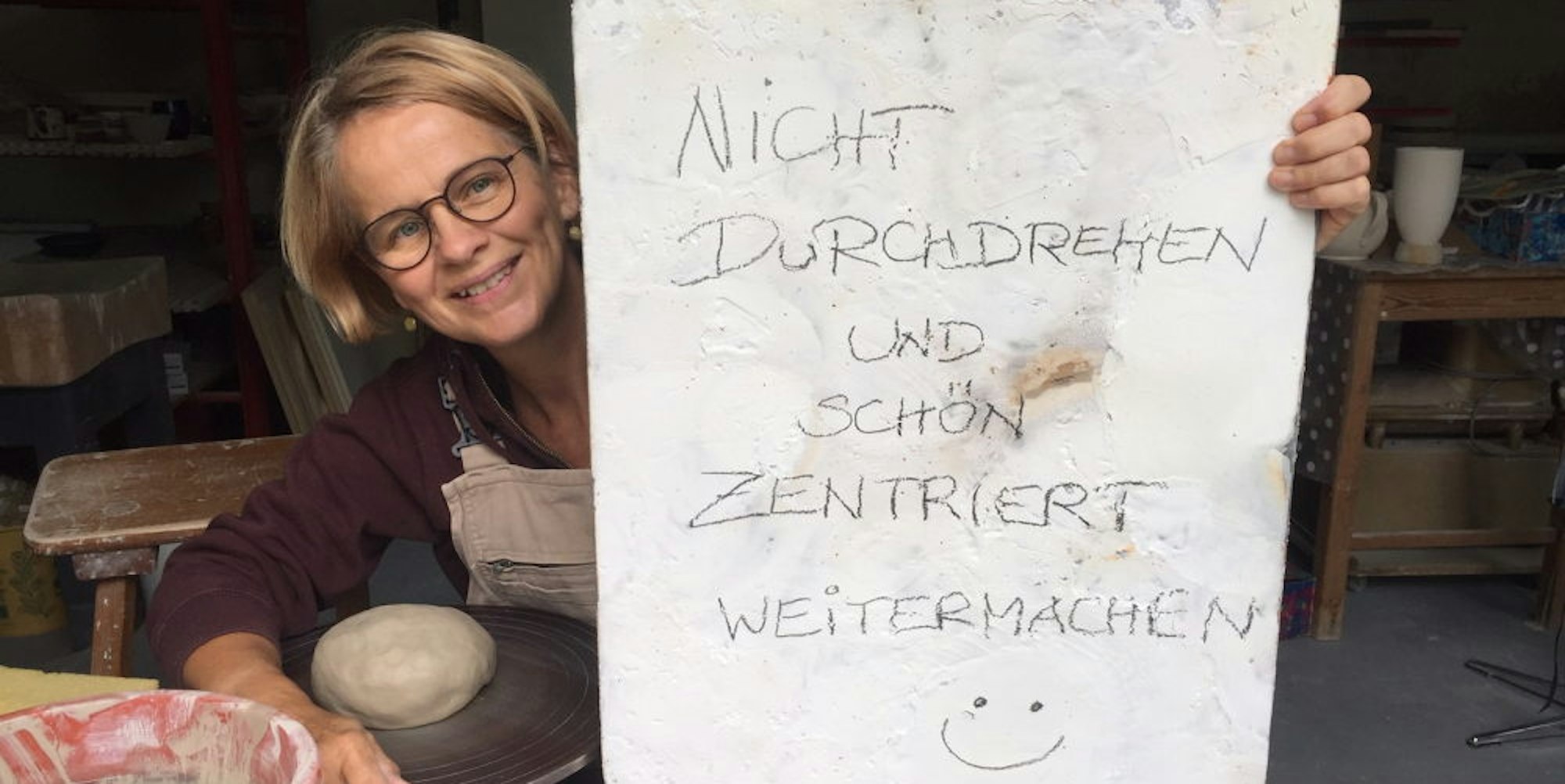 Siegburg – „Nicht durchdrehen und schön zentriert weitermachen“, mahnt Sabine Moshammer; neben sich ein Tonklumpen, der darauf wartet, zum Kunstwerk geformt zu werden. Aus der Werkstatt der Linzer Töpferin erreichte Ines Hasenberg in Siegburg diese Grußkarte – wie auch viel andere aufmunternde und verständnisvolle Post von Kolleginnen und Kollegen.