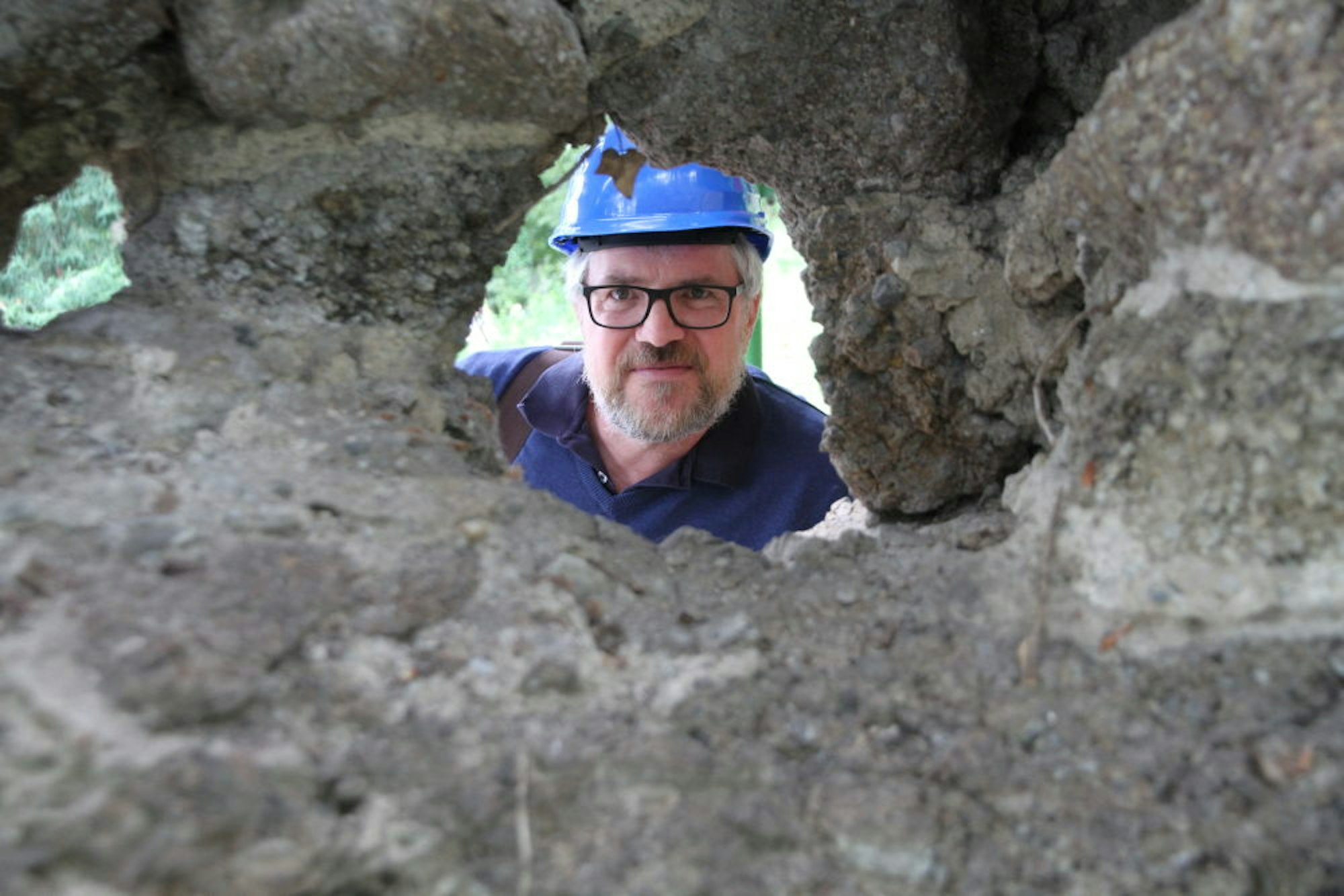 Karsten Monnerjahn untersucht die Mauer auf Schwachstellen.
