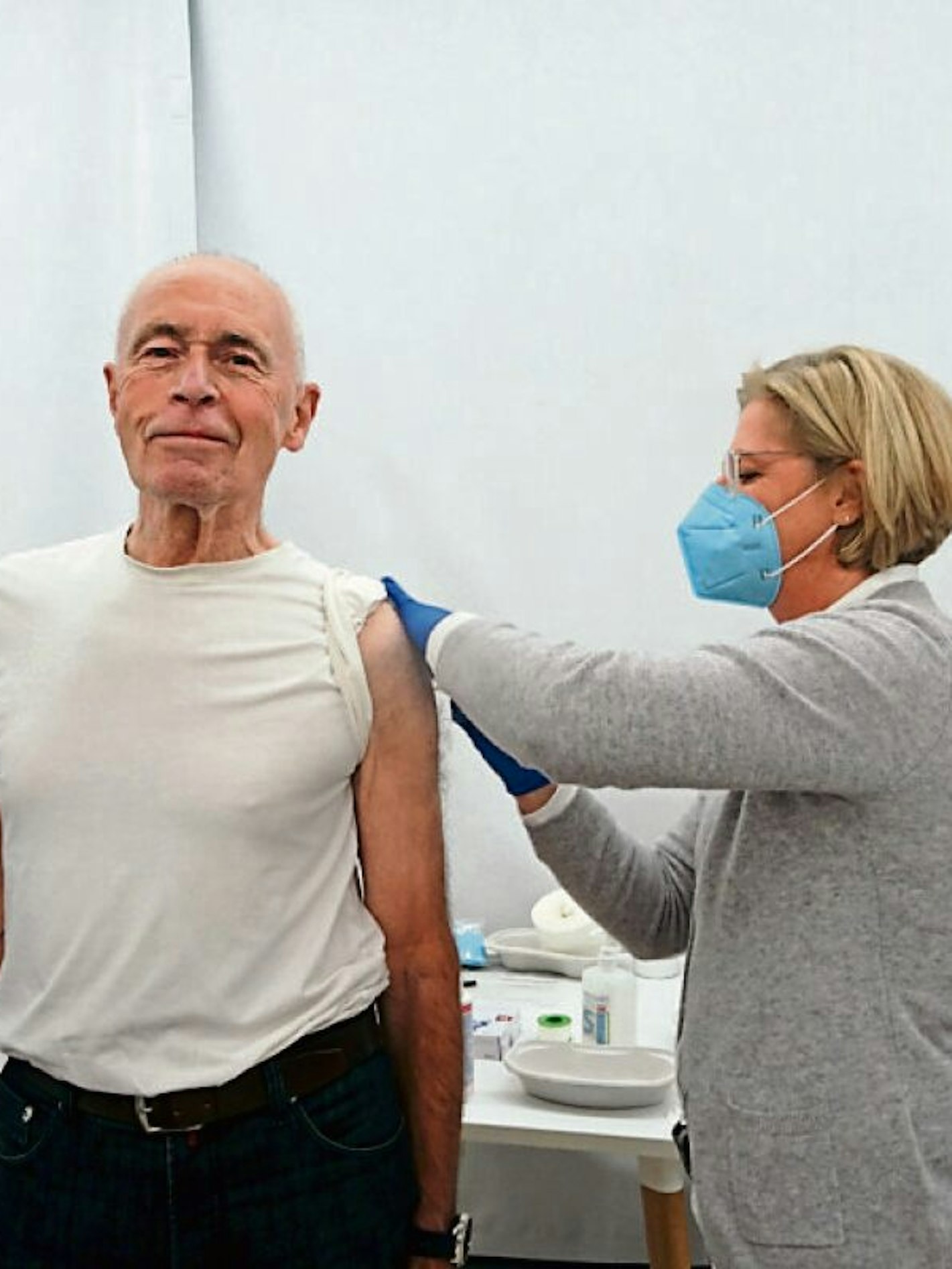 Hermann Peters aus Siegburg bekommt die Spritze von Dr. Kirsten Hasper.
