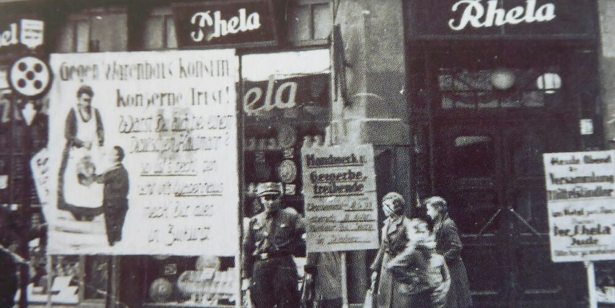 Das Foto entstand im Jahr 1933. Bereits in diesem Jahr standen SA-Leute mit Hetzplakaten vor dem jüdischen Kaufhaus Rhela an der Siegburger Bahnhofstraße.
