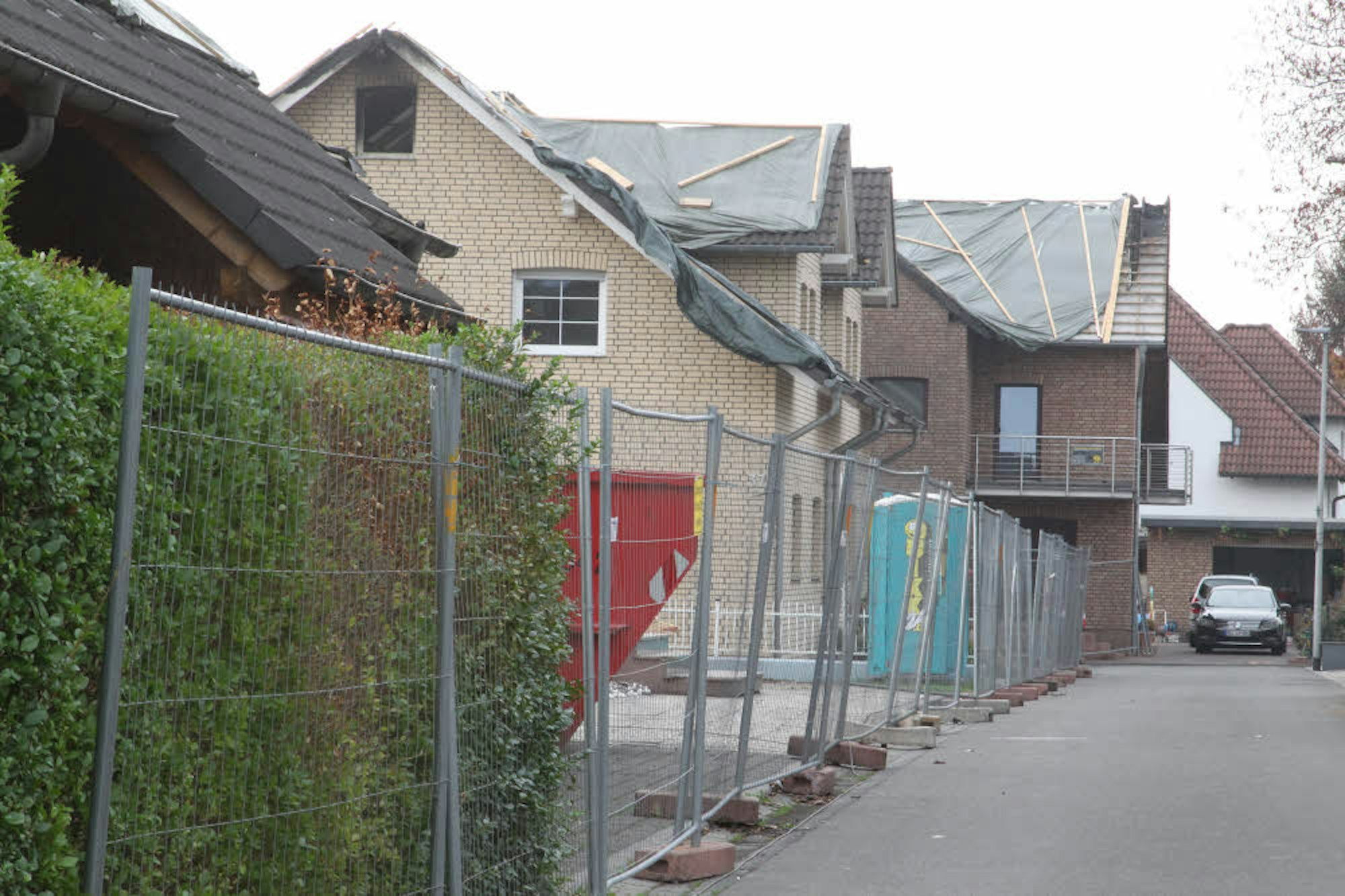 Ein Bauzaun sperrt die zerstörten Häuser ab, die mit Planen gegen Regen gesichert sind.