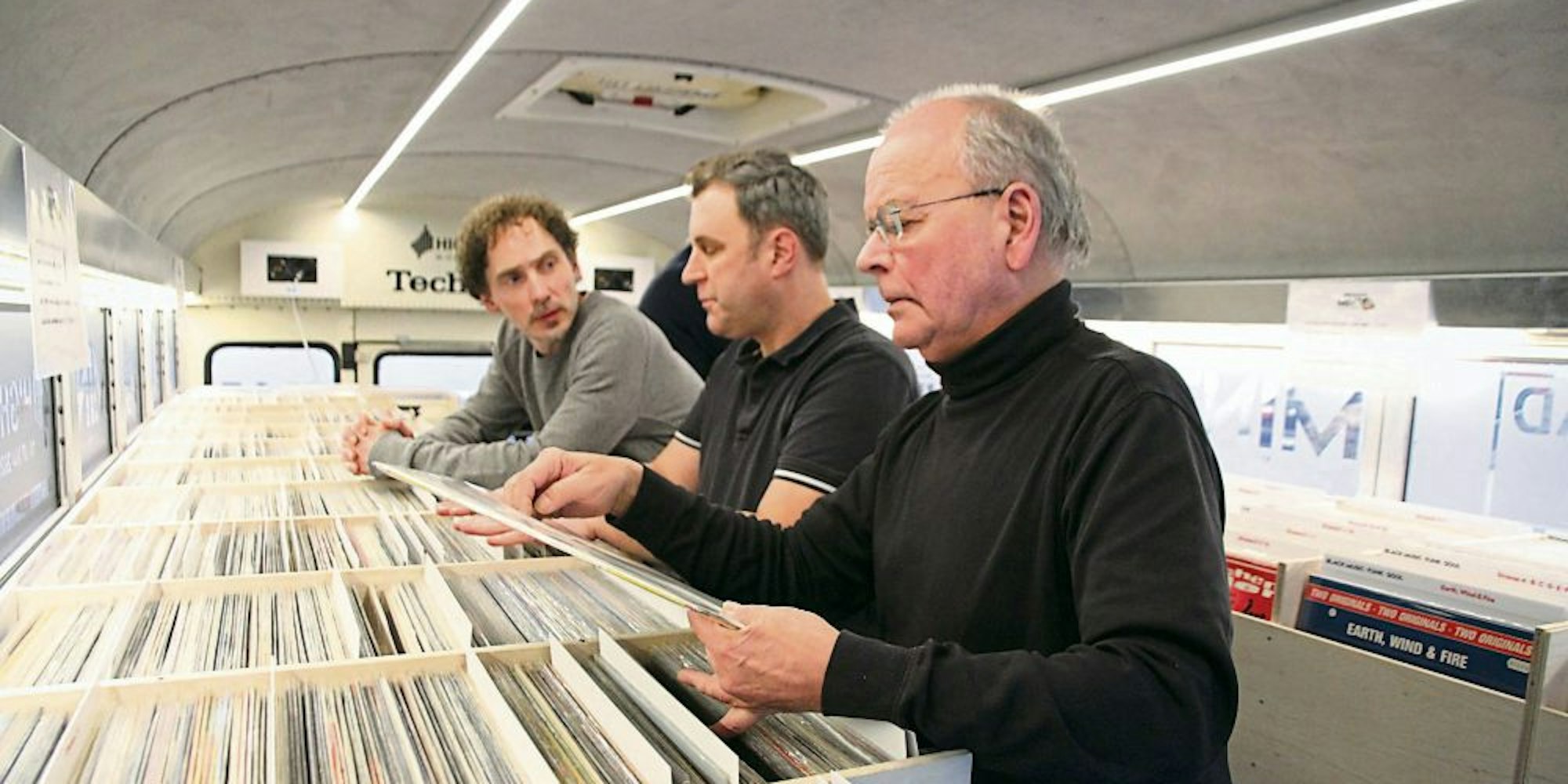 Stöbern und fachsimpeln im Mint-Vinyl-Bus: Michael Lohrmann (links) mit Sascha Engelskirchen und Kurt Ahlefelder von Hifi Engelskirchen.