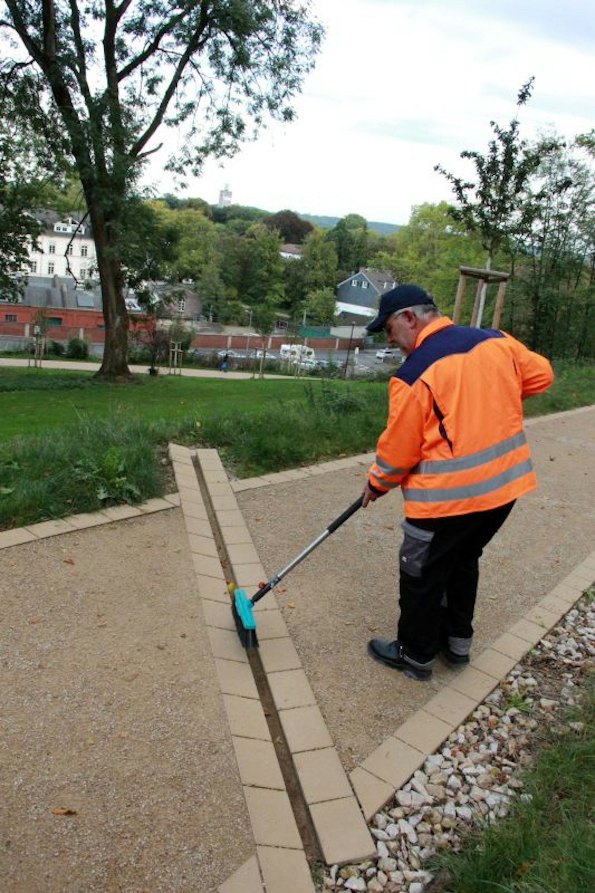 Er bewarb sich daraufhin bei der Stadt Siegburg. „Dort wurde mir erst einmal ein 450-Euro-Job am Michaelsberg angeboten“, berichtet er. Und die Tätigkeit an der frischen Luft bei Wind und Wetter gefällt ihm. Mit einem speziell zusammengestellten Wagen ist er für alle Fälle gerüstet. Ein Stecksystem ermöglicht es, dass Kavgic nicht zahlreiche Werkzeuge mit langen Stielen tragen muss. „Kippen finde ich immer jede Menge“, berichtet er beim Rundgang, der in gemächlichem Tempo stattfindet.