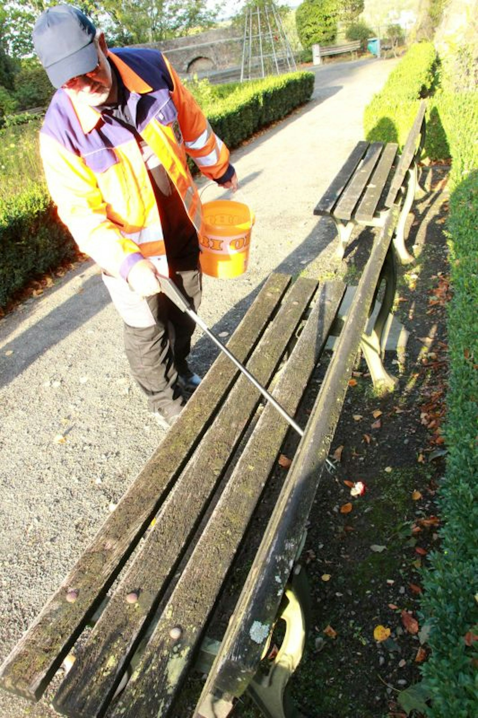 Beim Gang hoch zur Abtei stoppt er an einer Abflussrinne, die den Weg kreuzt. Er nimmt den Besen zur Hand und kehrt sie gewissenhaft sauber, „damit der Regen gut abfließen kann“. Mehr als ein Dutzend von ihnen gebe es. Dann geht es in Richtung Rosengarten. „Vor einigen Wochen war es noch wärmer, und hier lag mehr rum“, erzählt Kavgic, während er eine Plastikwasserflasche einlädt, die auf einem Mauervorsprung abgelegt wurde. Leere Bierflaschen finde er immer nach lauen Sommerabenden. Dazu benutzte Eisbecher, Pappkartons, Getränkedosen und vieles mehr.