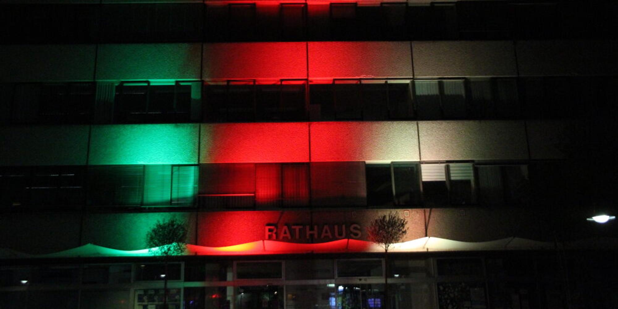 SPD, Grüne und FDP streben eine Ampel im Rat an und sorgten schon einmal für die passende Fassadenbeleuchtung.