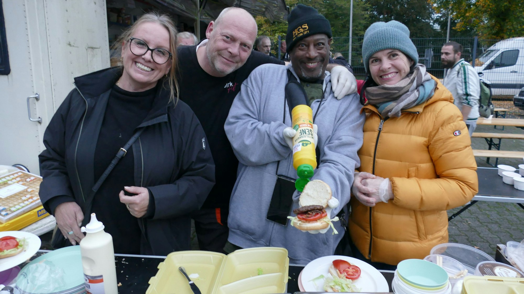 Boysie White belegt Burger mit "Siegburg hilft"-Gründerin Angela Holtmann (li.) und weiteren Ehrenamtlichen.