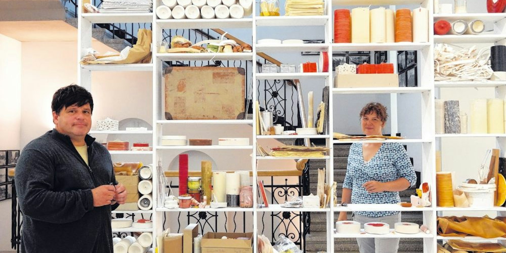 Siegburg – Papierschnipsel und Pinsel, Gipsabdrücke und Gummirollen, Klebebänder und ein alter Koffer: Allerlei Arbeitsmaterialien und Krempel stapeln sich in einem Regal, das Werner Fritz für seine Ausstellung im Stadtmuseum Siegburg bestückt hat. Damit gewährt der Bonner sozusagen einen Einblick in seine Werkstatt. Hier nämlich hortet er Fundstücke, die ihm neue Inspirationen für seine Zeichnungen und Bilder geben.
