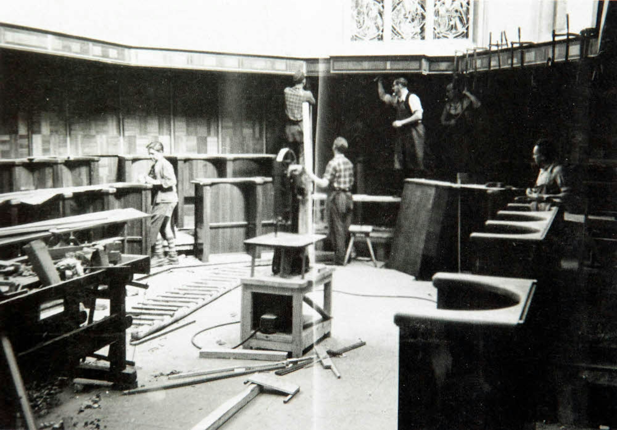 Den Einbau des Chorgestühls, das 2015 samt der von Siegburgern gestifteten Heiligenfiguren übereilt abgerissen wurde, zeigt dieses Foto.