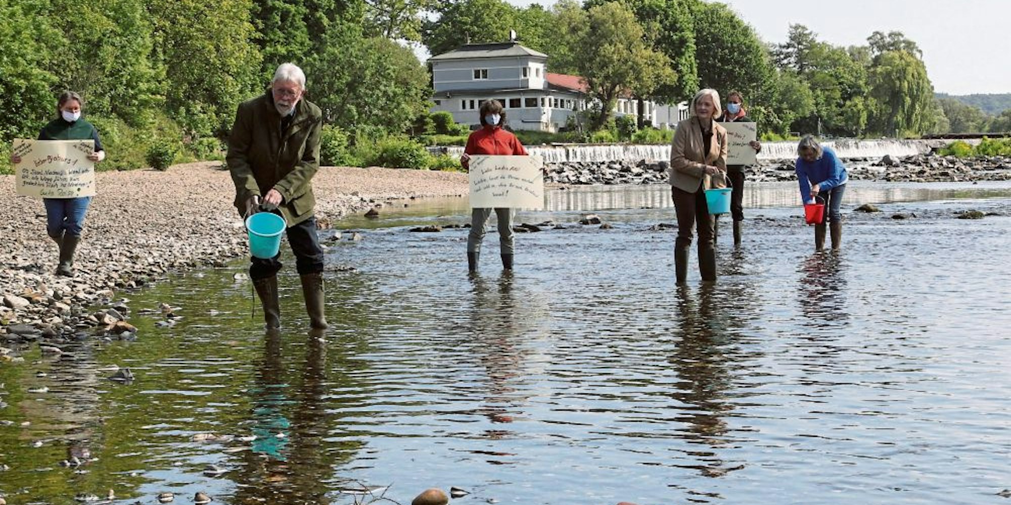 Helferinnen und Helfer setzen die Lachse frei und schicken Botschaften über Schilder.