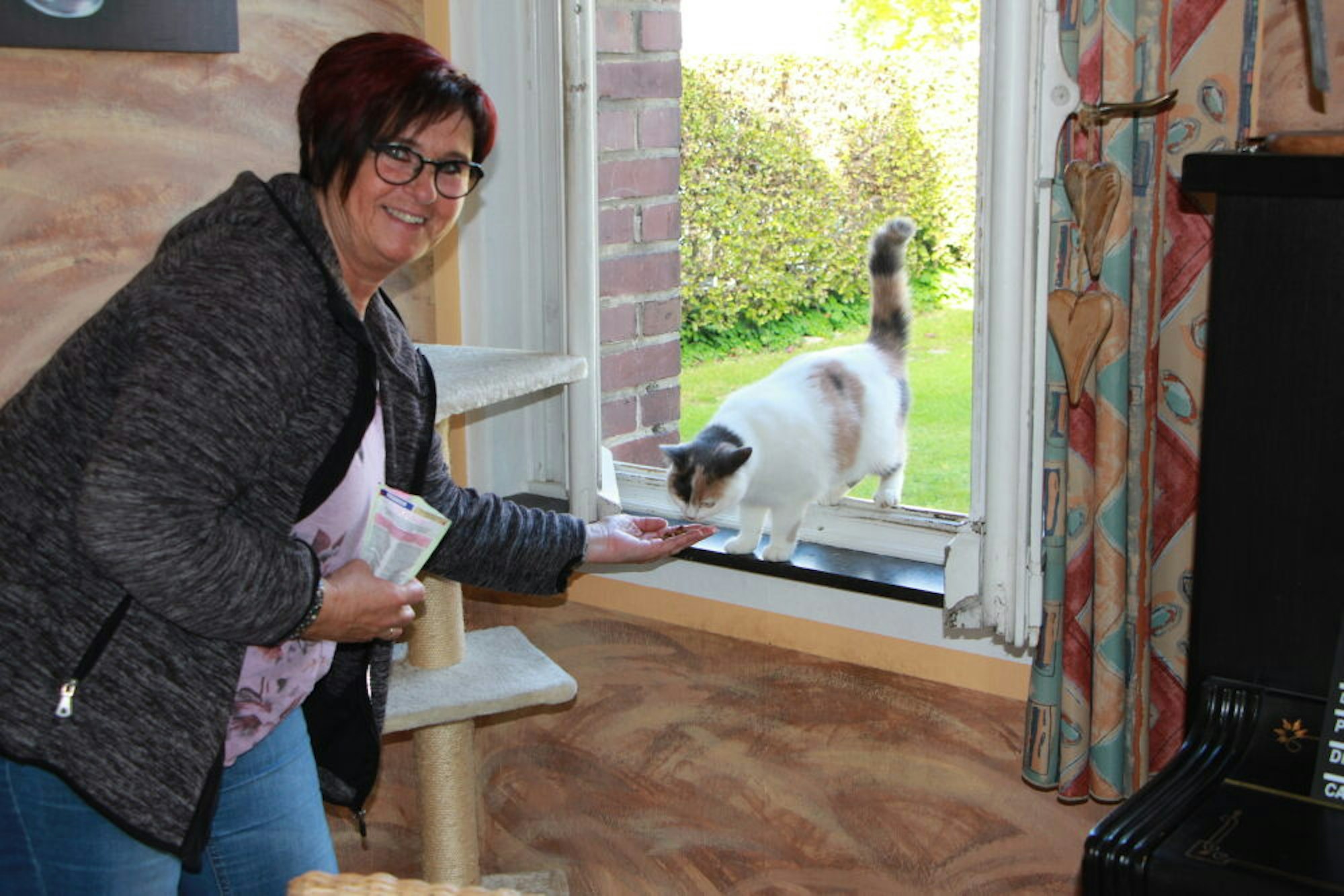 Elisabeth Schubert mit Shirley am Fenster, wo laut miaut wird.
