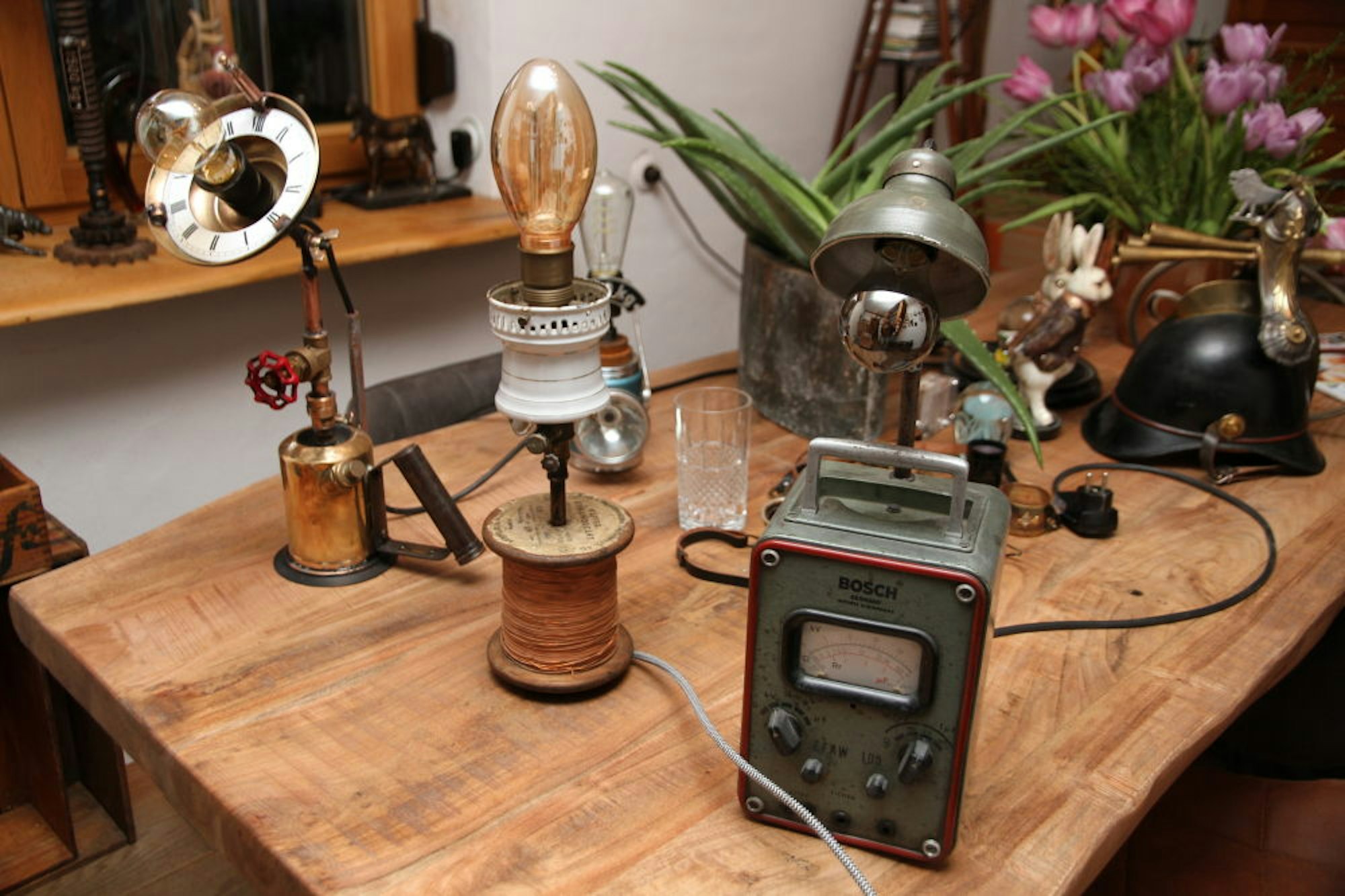 Unübersehbar kommt Steampunk zudem der Technikbegeisterung von Kurz entgegen: In seinem Fachwerkhaus bringt er das Kunststück fertig, eine Unmenge an historischen, originellen und kuriosen Dingen zu versammeln, ohne dass die Räume vollgestopft wirken. Neben alten Emailleschildern und Fotos finden sich ein alter Spielautomat mit Uhrwerkantrieb, alte Sicherungskästen, eine russische Butterkiste, Modelleisenbahnen, Scheinwerfer, Uhren, Messgeräte, Rechenmaschinen und natürlich viele selbstgebaute Gerätschaften wie der Zeitreisestab, die Goggles und mehrere Tischlampen. Die stellt Kurz aus verschiedenen Einzelteilen her, Zifferblättern, Zahnrädern, alten Telefonen oder Gasbrennern. Zum nostalgischen Design passen die großen Glühbirnen, die allerdings voll auf der Höhe der Zeit sind: Sie umhüllen aktuelle LEDs. Um die Lampen zu verkaufen, meldete er ein Kleingewerbe an.